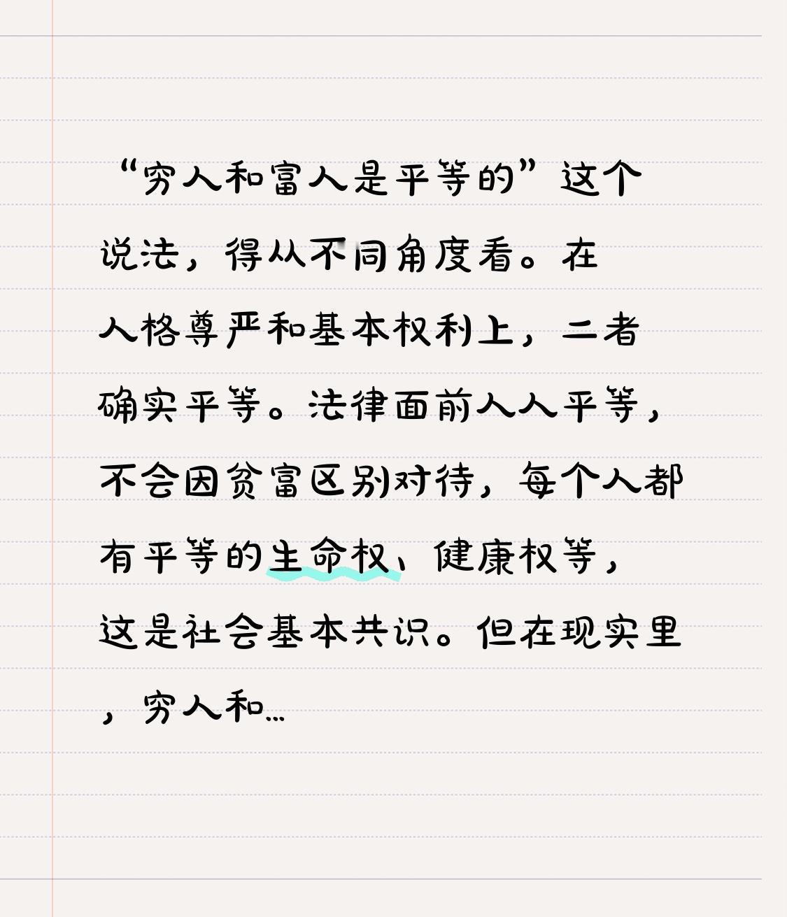 “穷人和富人是平等的”这个说法,得从不同角度看。在人格尊严和基本权利上,二者确实平等。法律面前人人平等,不会因贫富区别对待,每个人都有平等的生命权、健康权等,这是社会基本共识。