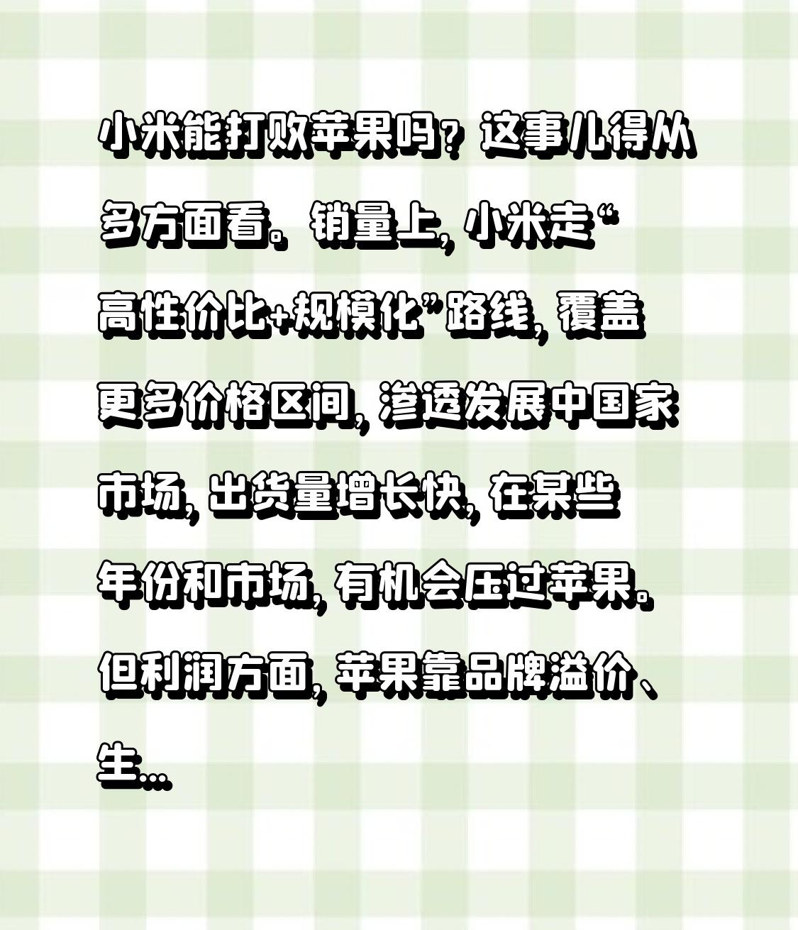 但利润方面,苹果靠品牌溢价、生态闭环和高用户忠诚度,一部iPhone利润能顶几部中端机,小米强调性价比,压低了利润空间,想超越苹果难度大。