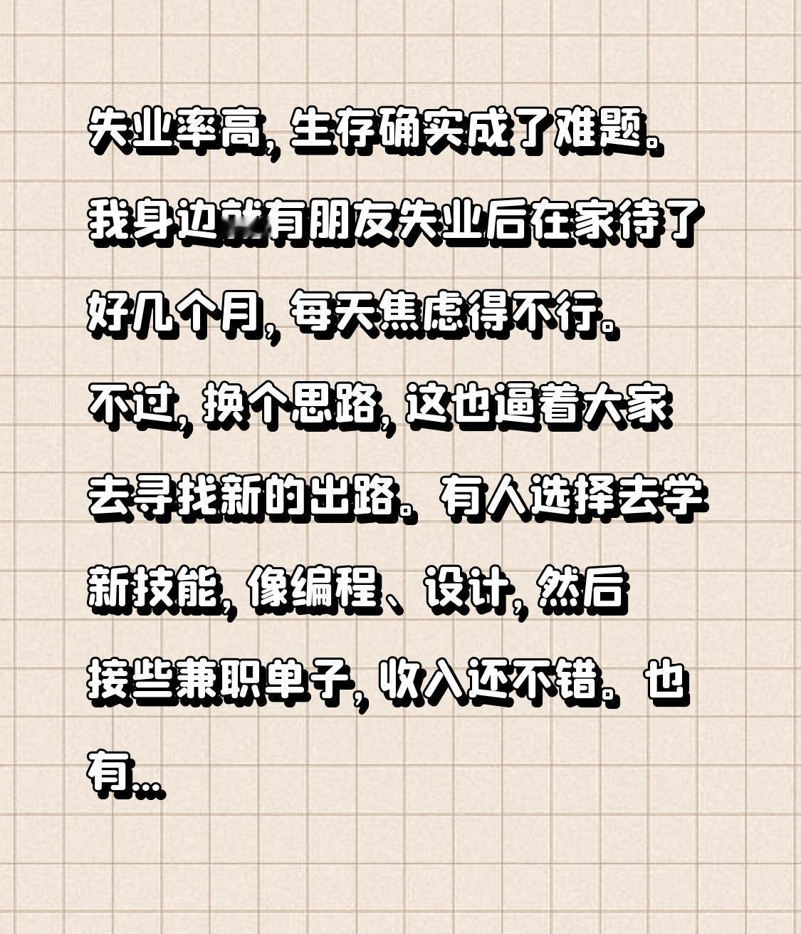失业率高,生存确实成了难题。我身边就有朋友失业后在家待了好几个月,每天焦虑得不行。不过,换个思路,这也逼着大家去寻找新的出路。