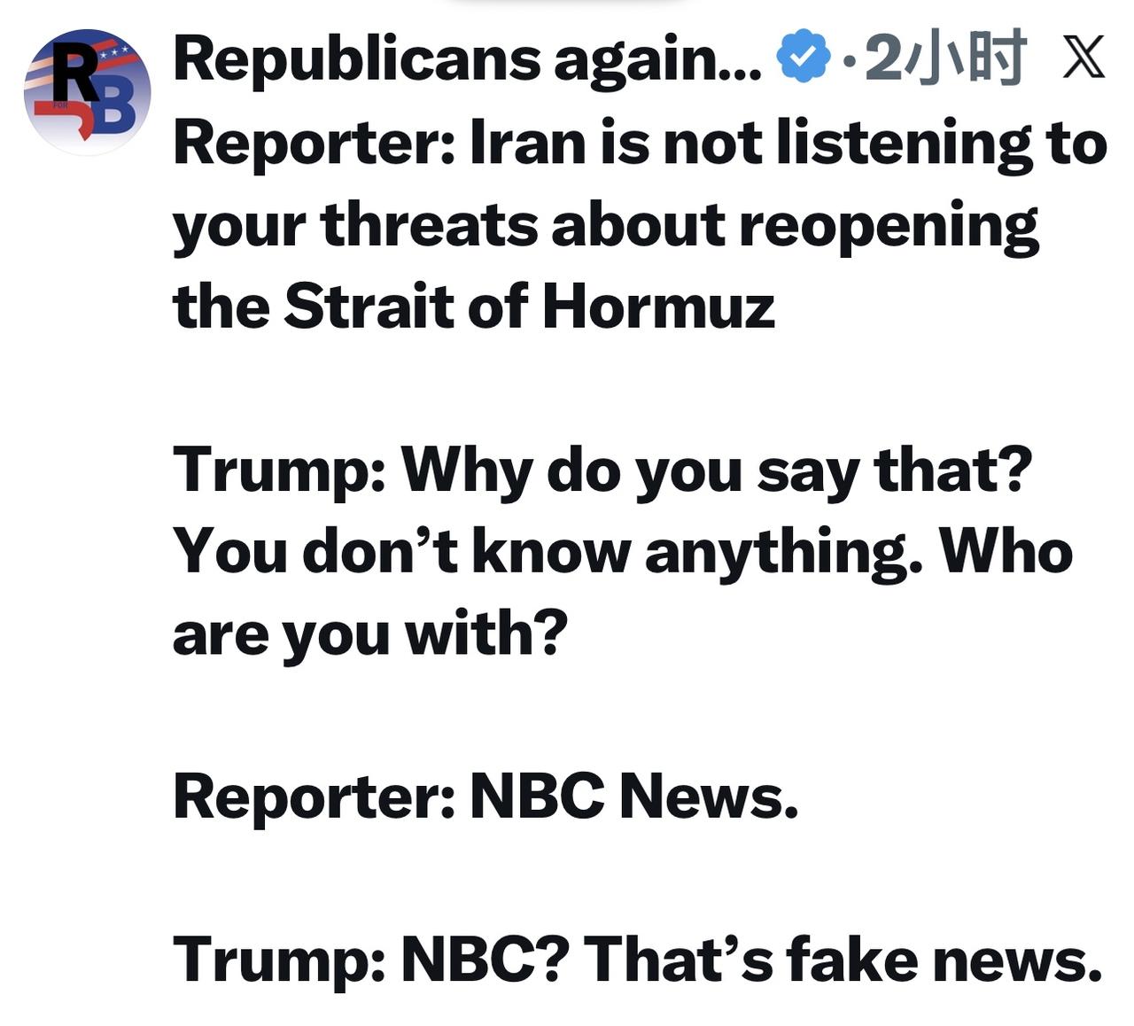 记者:伊朗没有听从你关于重新开放霍尔木兹海峡的威胁 特朗普:你为什么这么说?你