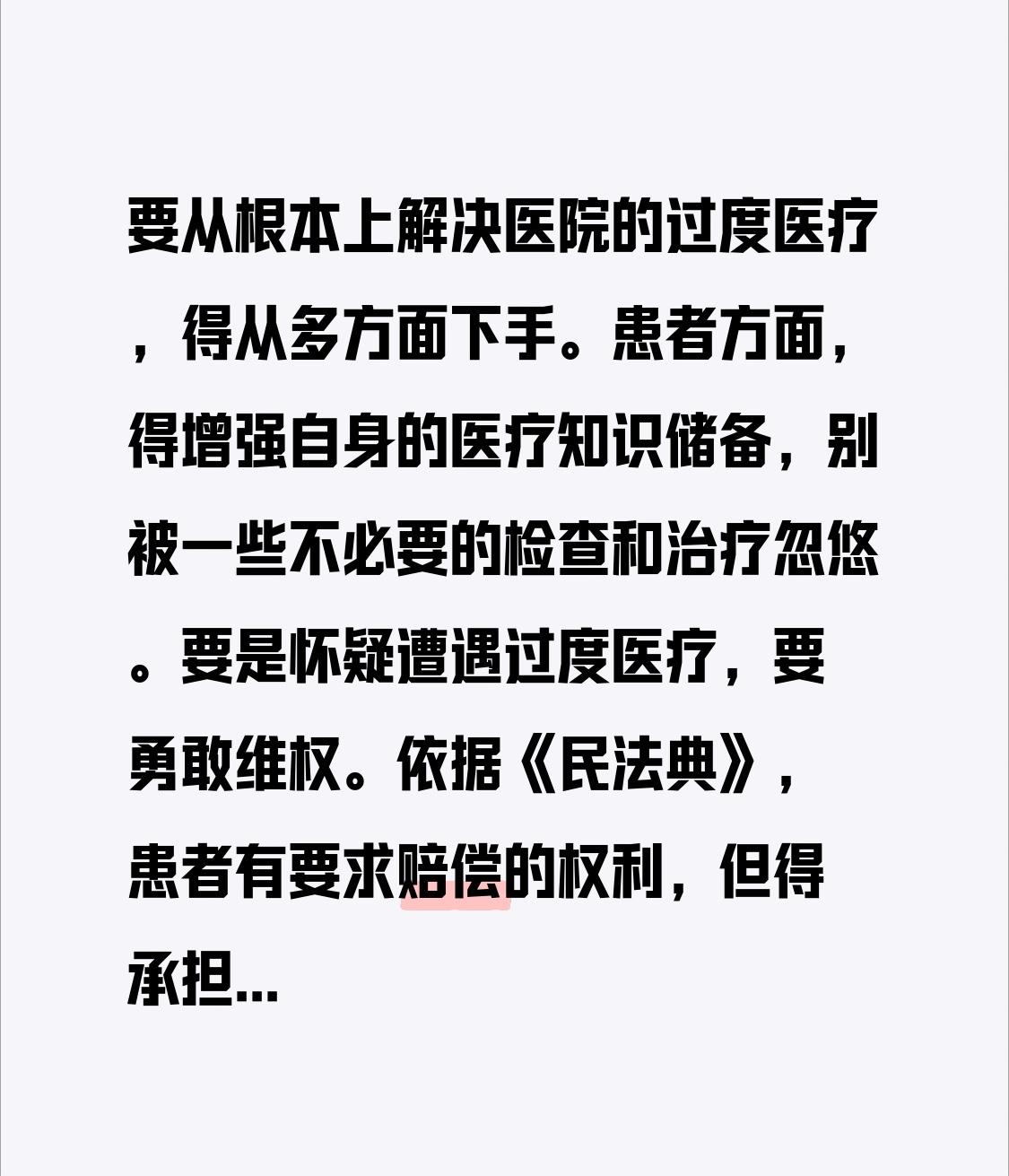 要从根本上解决医院的过度医疗,得从多方面下手。患者方面,得增强自身的医疗知识储备,别被一些不必要的检查和治疗忽悠。要是怀疑遭遇过度医疗,要勇敢维权。依据《民法典》,患者有要求赔偿的权利,但得承担举证责任,像病历、费用清单等都是重要证据。