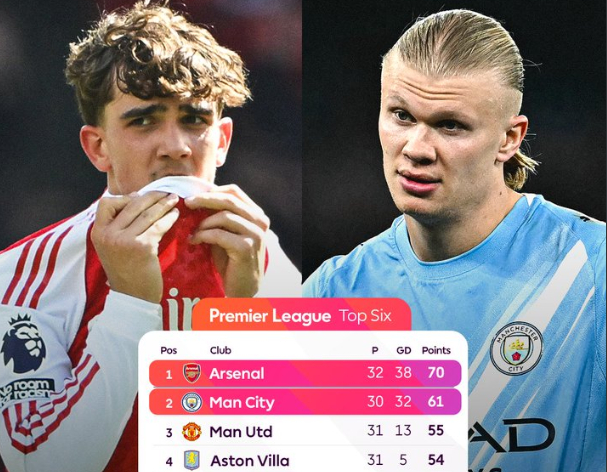 能否逆袭?阿森纳32轮70分,多赛两轮领先曼城9分!曼城30轮61分,净胜球32