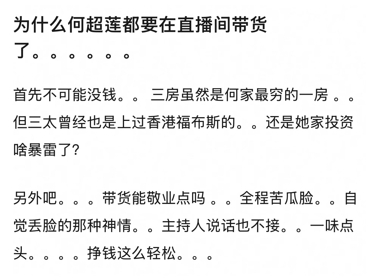 何超莲在直播间带货被审判了,网友说她没有敬业精神,全程苦瓜脸,一股自觉丢脸的那种
