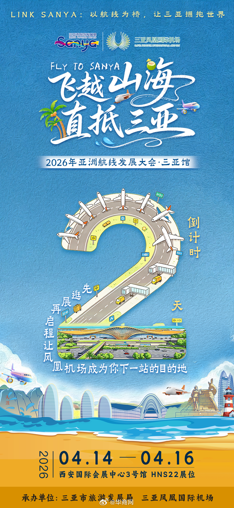航行山海,为你而来!#RoutesAsia2026#第二十二届亚洲航线发展大会・三亚馆倒计时2天!从三亚凤凰国际机场出发,让每一次起飞都奔赴山海,让每一段旅程都遇见惊喜!#FlyToSanya#4月14-16日,西安国际会展中心3号馆HNS22展位,三亚馆诚邀全球航空业界代表感受热带滨海风光、共话航空领域合作!#AsianBeachGames2026#我的三亚时刻#
