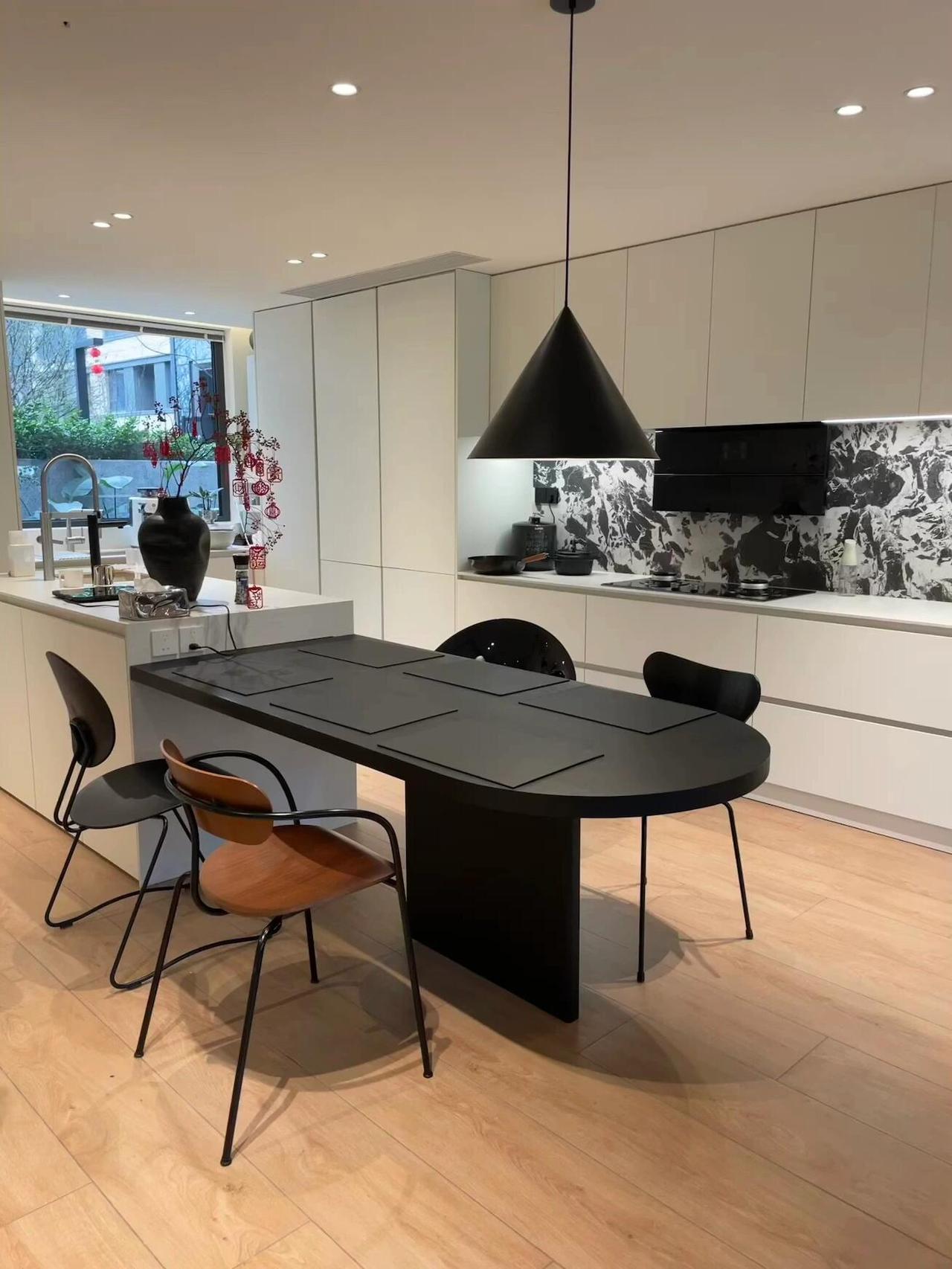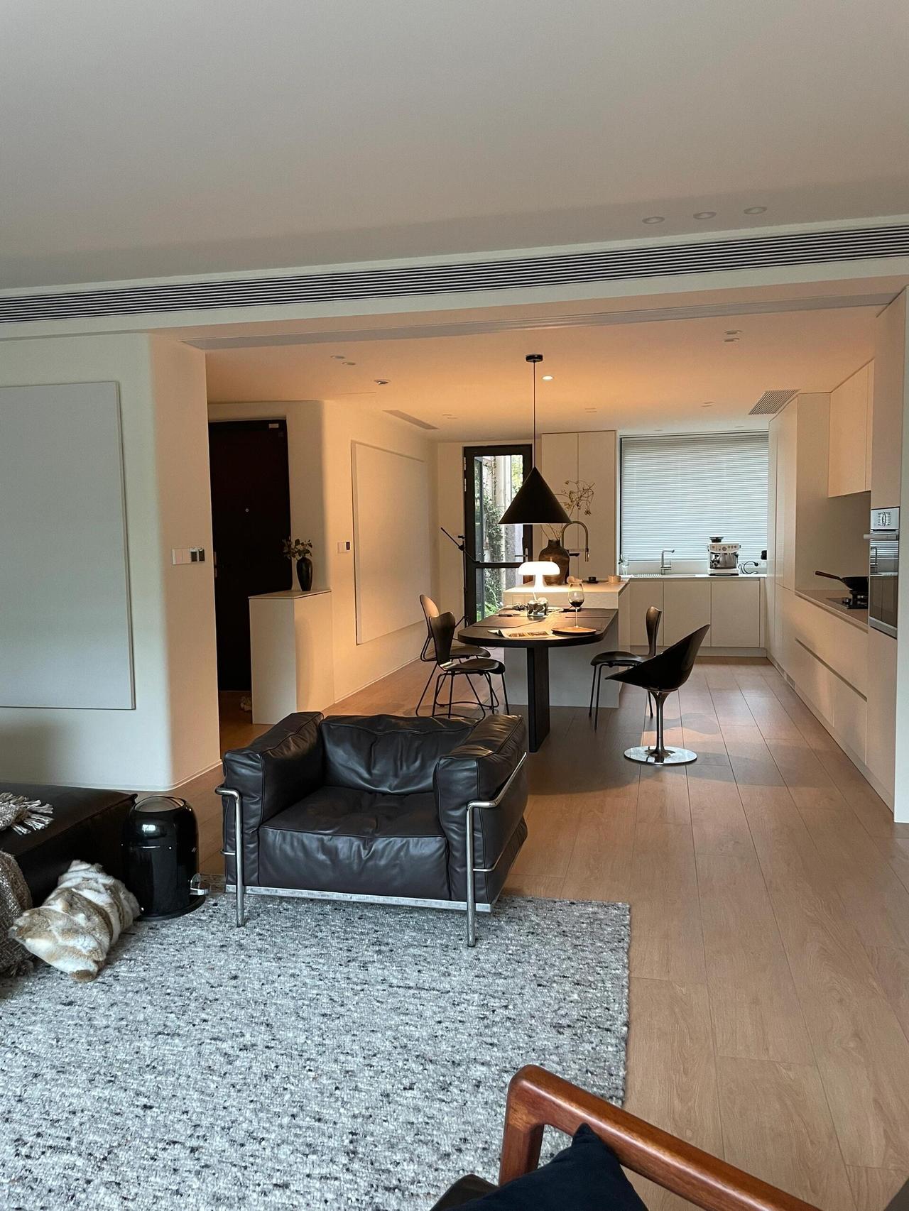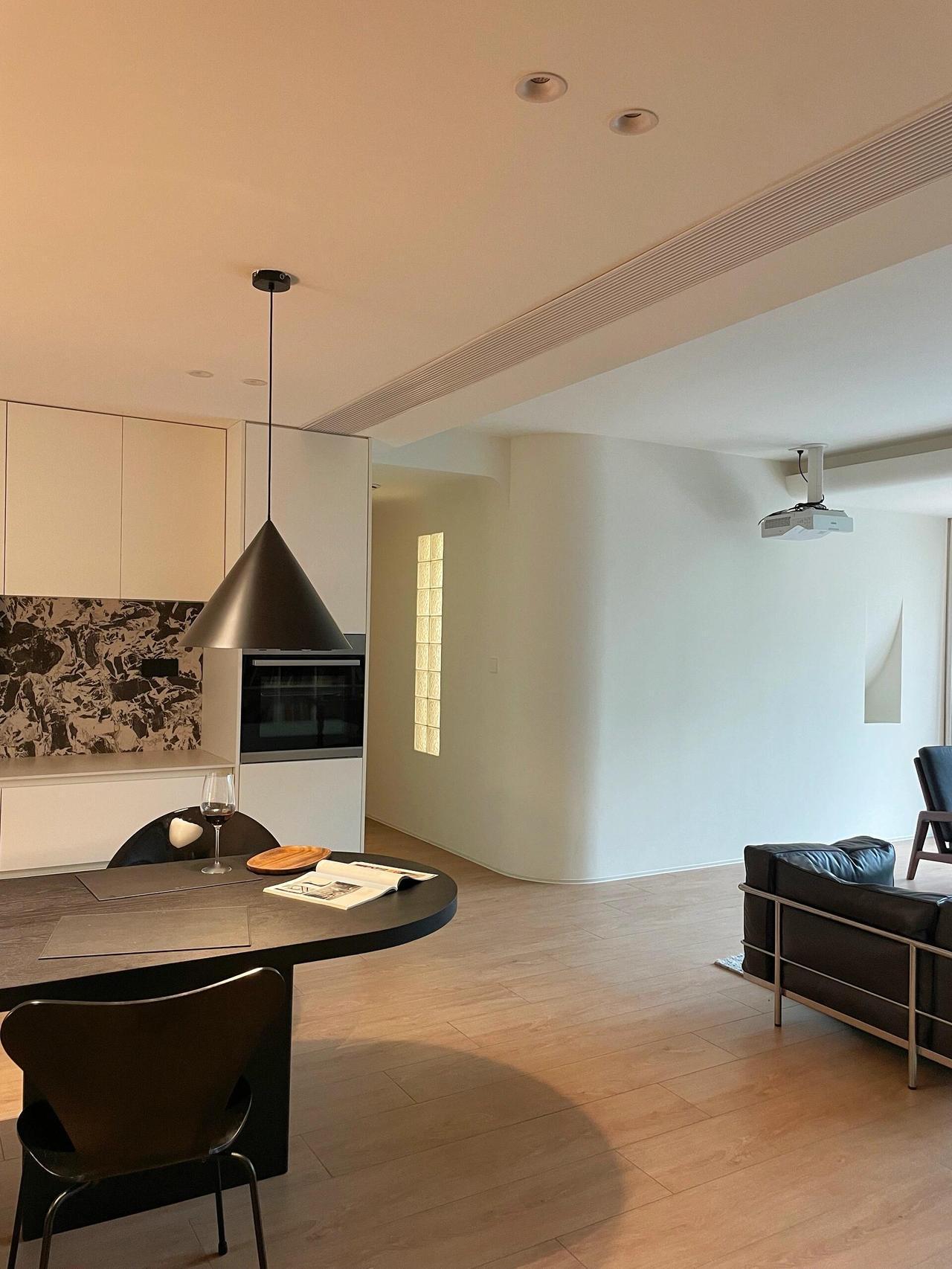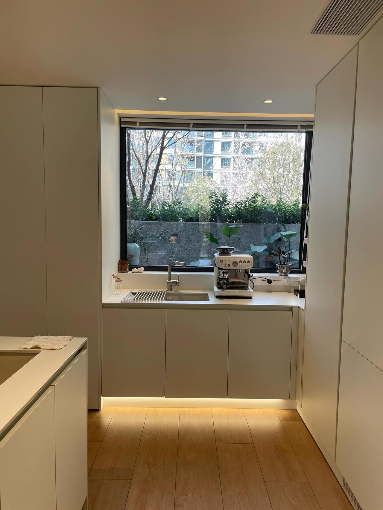 交房那天,我其实有点慌。原来的格局被隔成了一个个小房间,又暗又挤,于是干脆全部打通:客厅、餐厅、厨房、书房,连成一体。敲掉非承重墙之后,整个空间豁然开朗,最让我心动的是客厅那扇大落地窗——窗外是小区的绿化带,树木长得比三楼还高,枝繁叶茂,一眼望出去全是绿色。