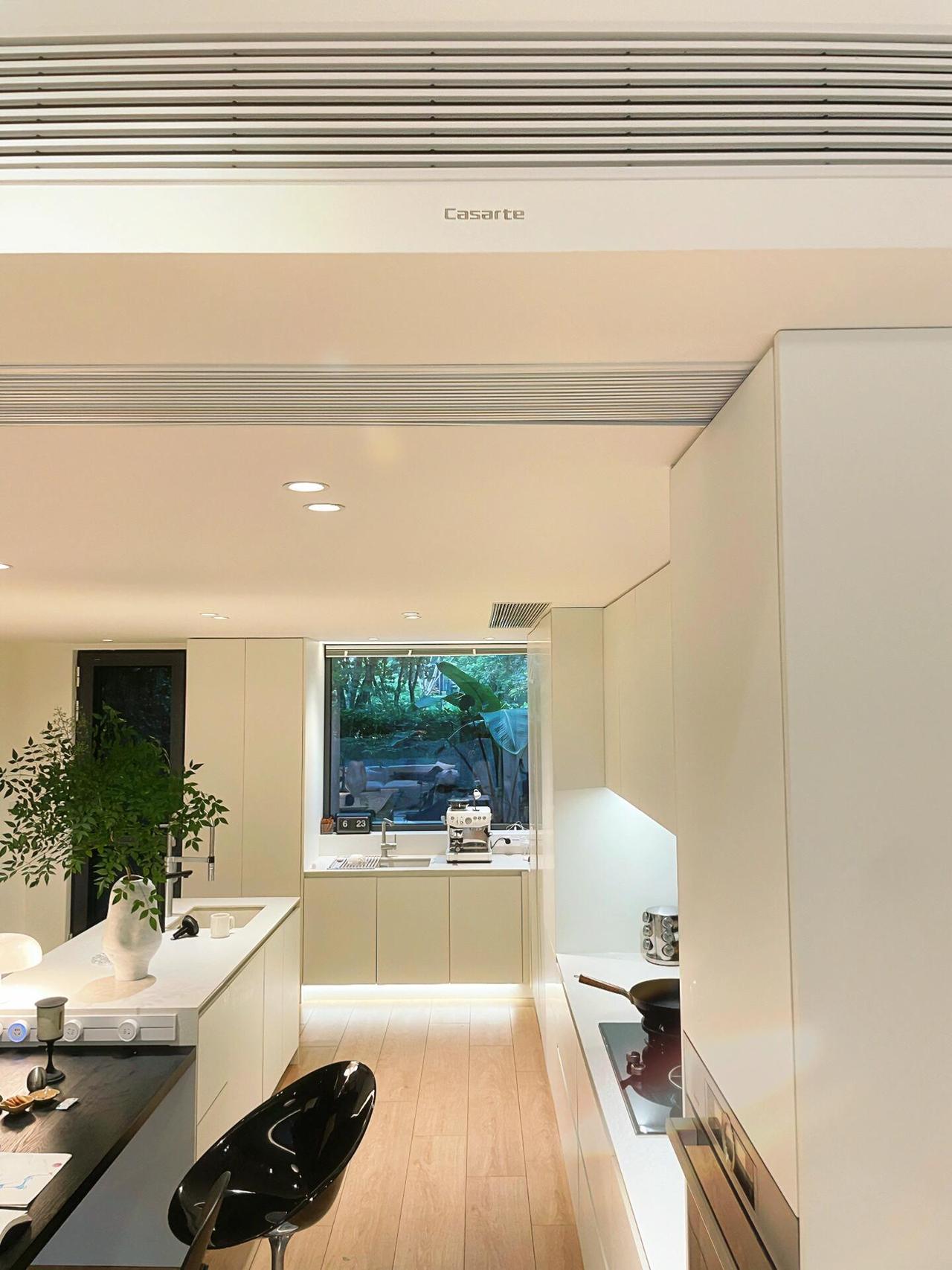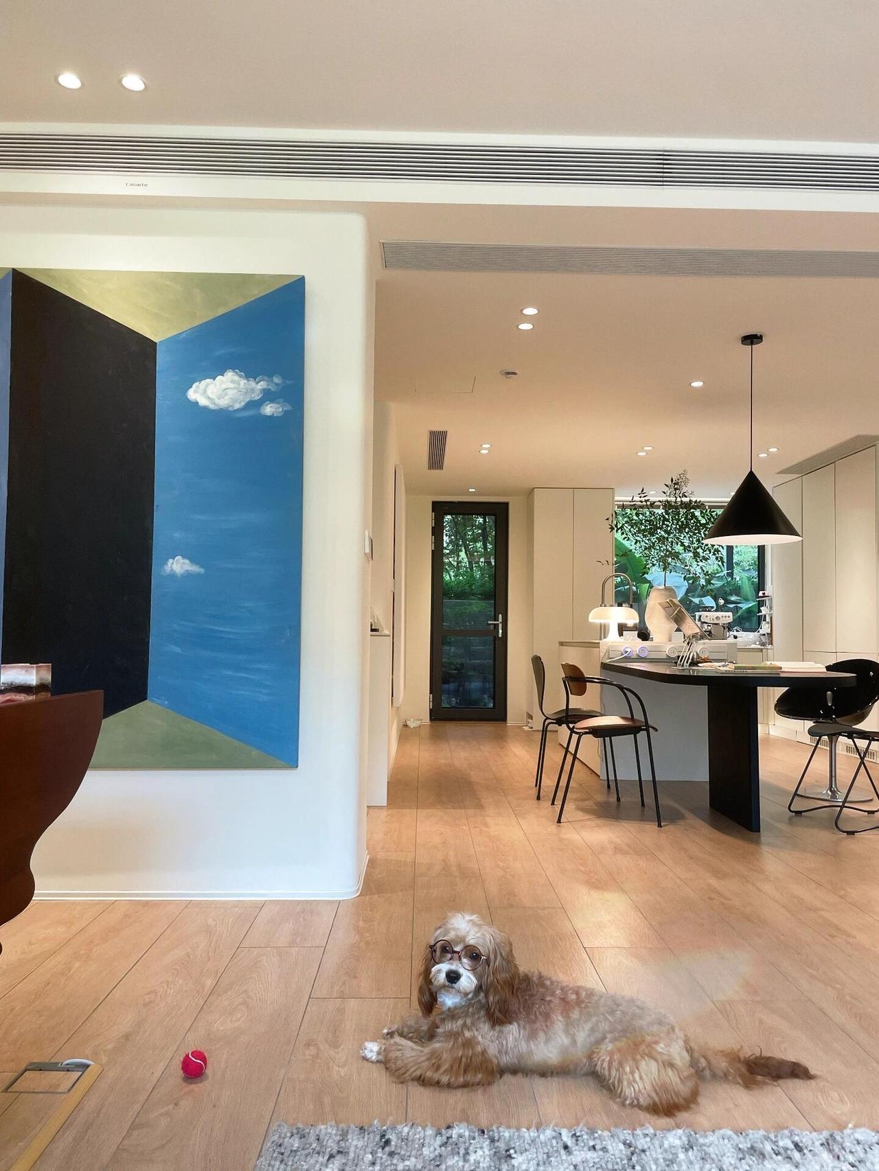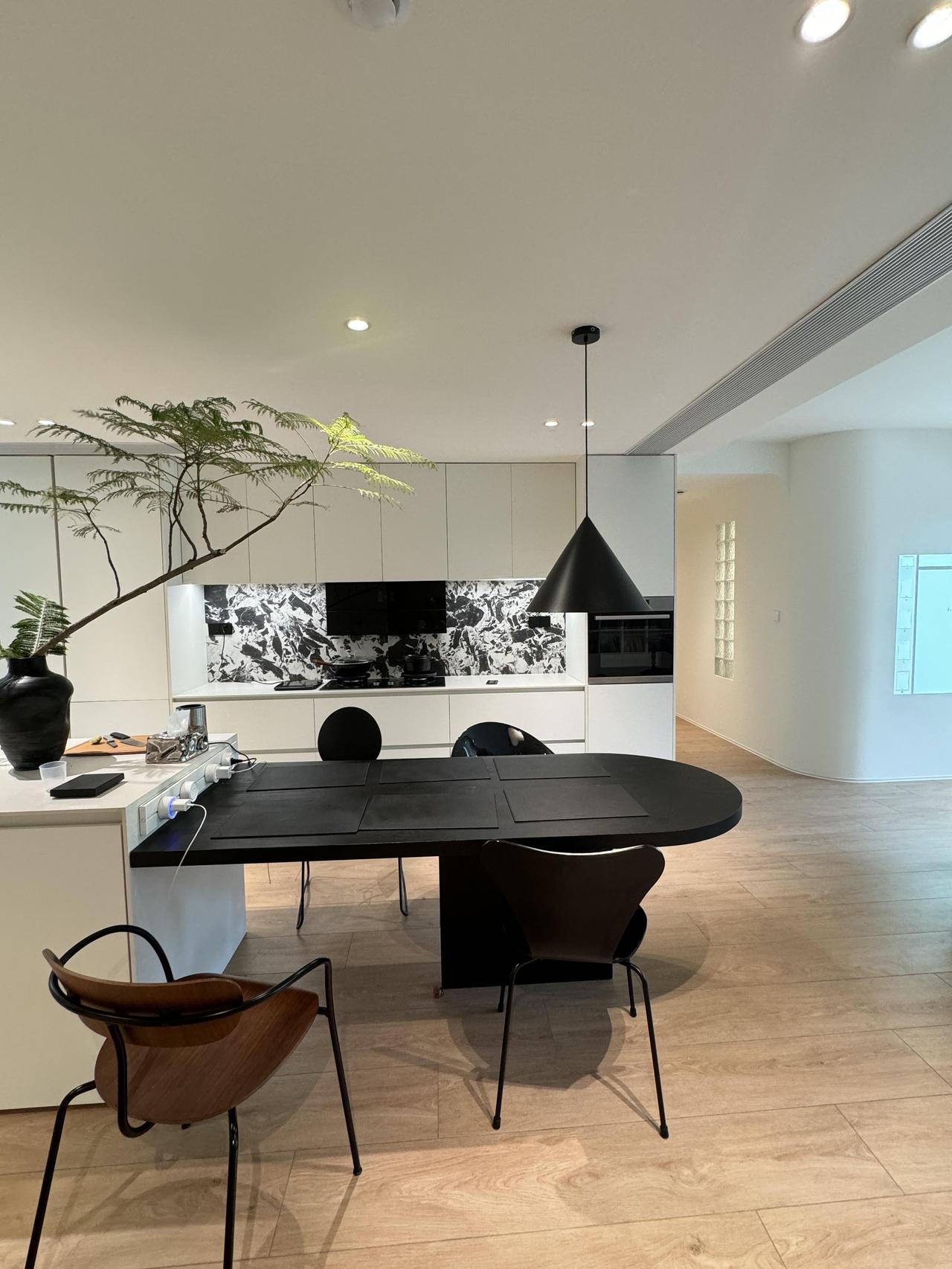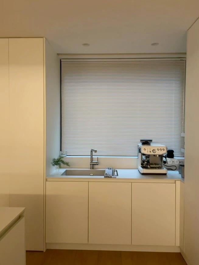 交房那天,我其实有点慌。原来的格局被隔成了一个个小房间,又暗又挤,于是干脆全部打通:客厅、餐厅、厨房、书房,连成一体。敲掉非承重墙之后,整个空间豁然开朗,最让我心动的是客厅那扇大落地窗——窗外是小区的绿化带,树木长得比三楼还高,枝繁叶茂,一眼望出去全是绿色。