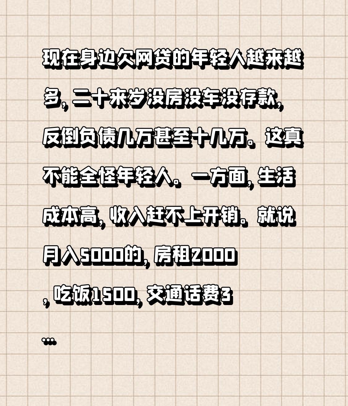 现在身边欠网贷的年轻人越来越多,二十来岁没房没车没存款,反倒负债几万甚至十几万。这真不能全怪年轻人。
