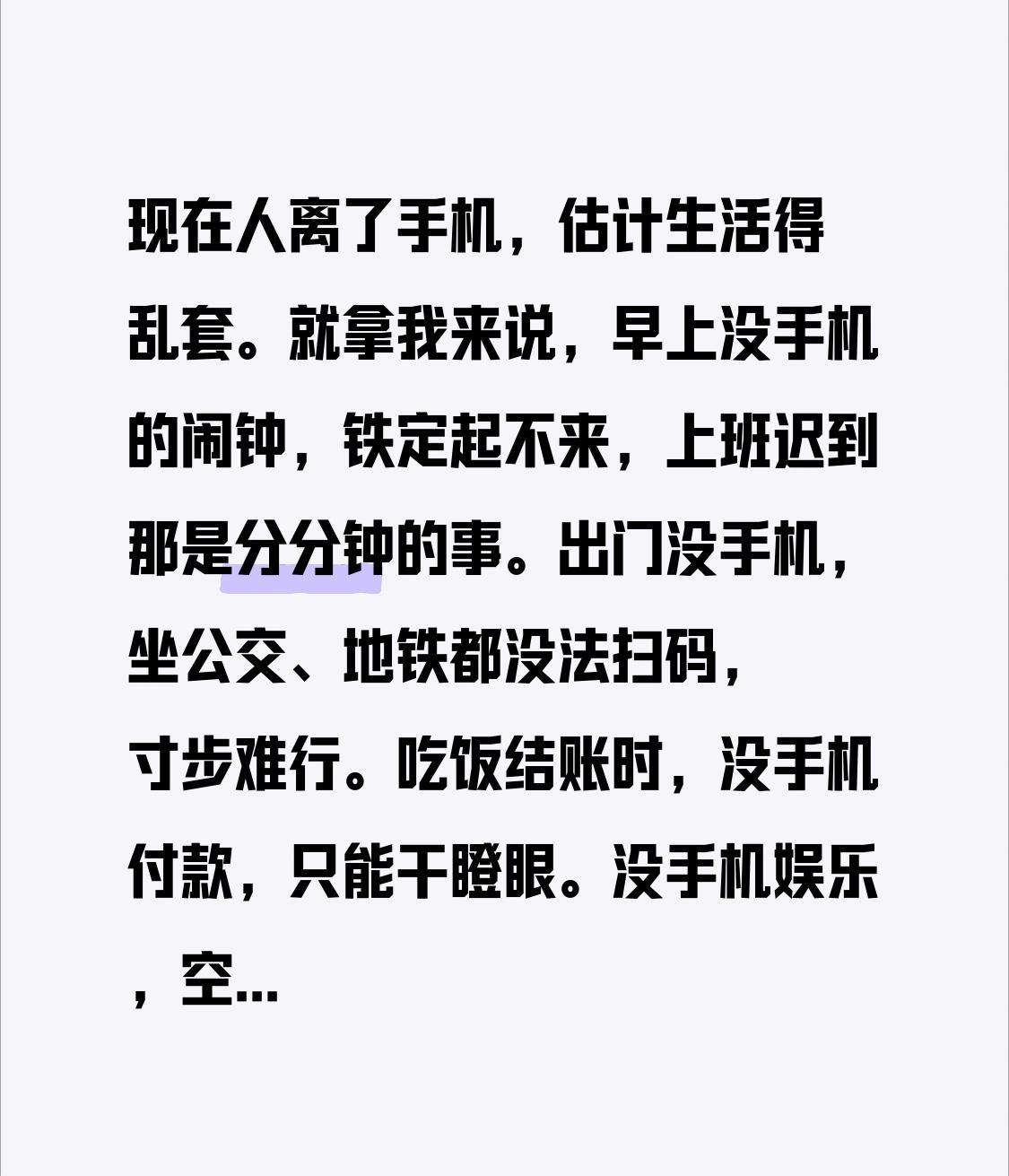现在人离了手机,估计生活得乱套。就拿我来说,早上没手机的闹钟,铁定起不来,上班迟到那是分分钟的事。出门没手机,坐公交、地铁都没法扫码,寸步难行。吃饭结账时,没手机付款,只能干瞪眼。