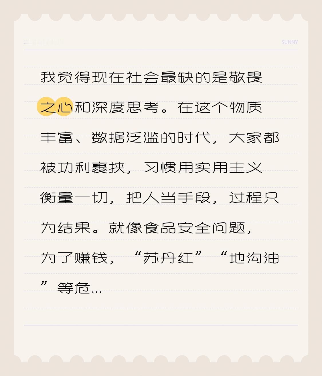 我觉得现在社会最缺的是敬畏之心和深度思考。在这个物质丰富、数据泛滥的时代,大家都被功利裹挟,习惯用实用主义衡量一切,把人当手段,过程只为结果。