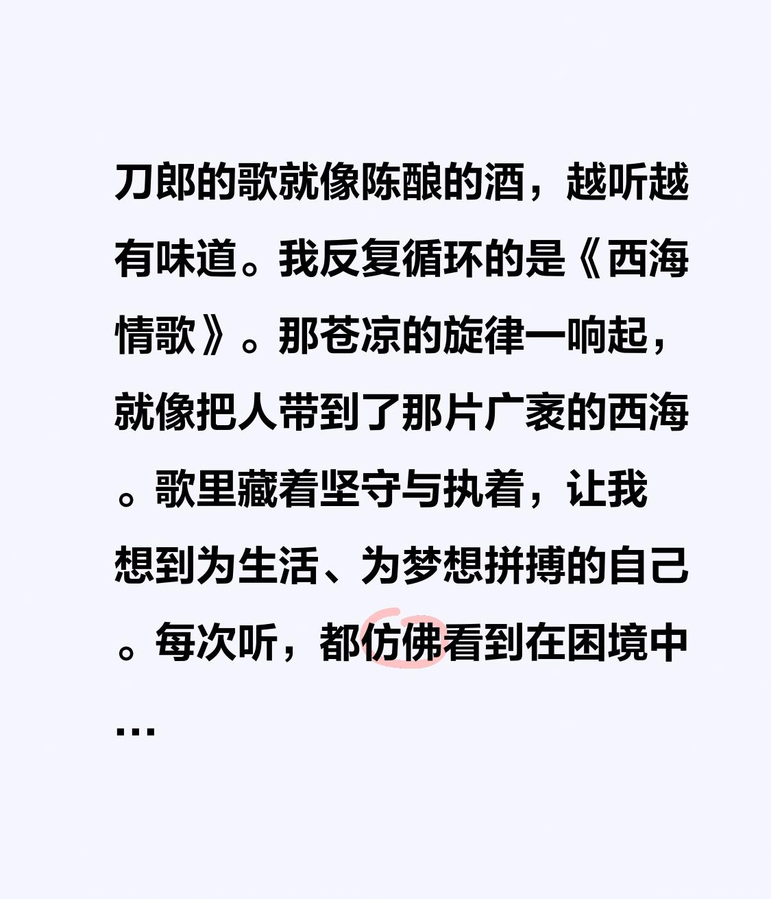 刀郎的歌就像陈酿的酒,越听越有味道。我反复循环的是《西海情歌》。那苍凉的旋律一响起,就像把人带到了那片广袤的西海。