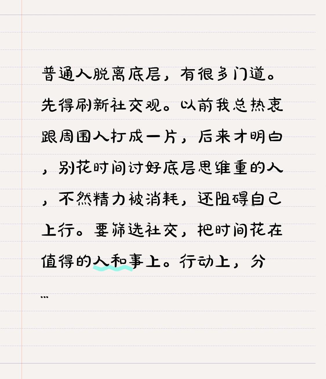 先得刷新社交观。以前我总热衷跟周围人打成一片,后来才明白,别花时间讨好底层思维重的人,不然精力被消耗,还阻碍自己上行。要筛选社交,把时间花在值得的人和事上。
