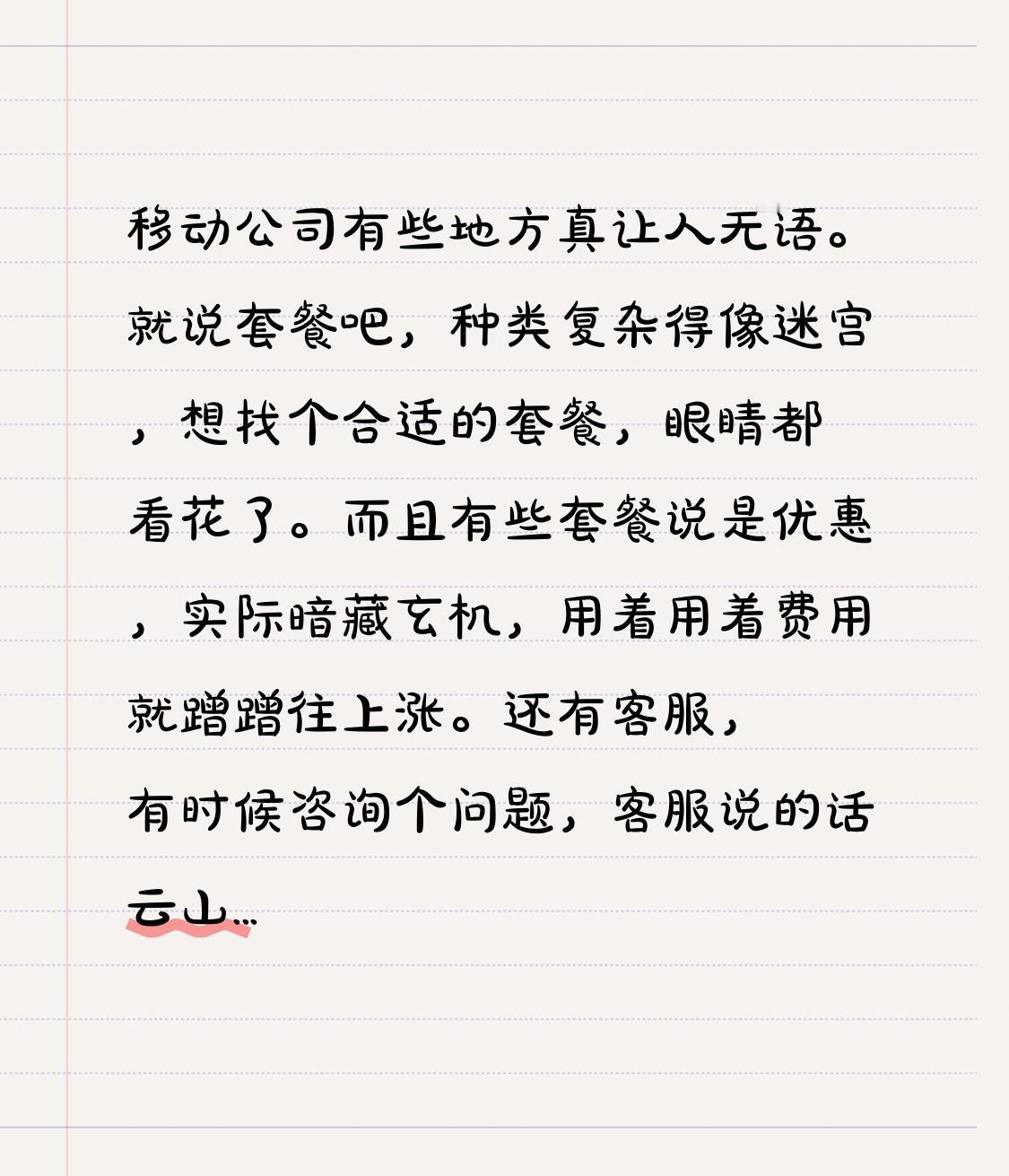 移动公司有些地方真让人无语。就说套餐吧,种类复杂得像迷宫,想找个合适的套餐,眼睛都看花了。而且有些套餐说是优惠,实际暗藏玄机,用着用着费用就蹭蹭往上涨。