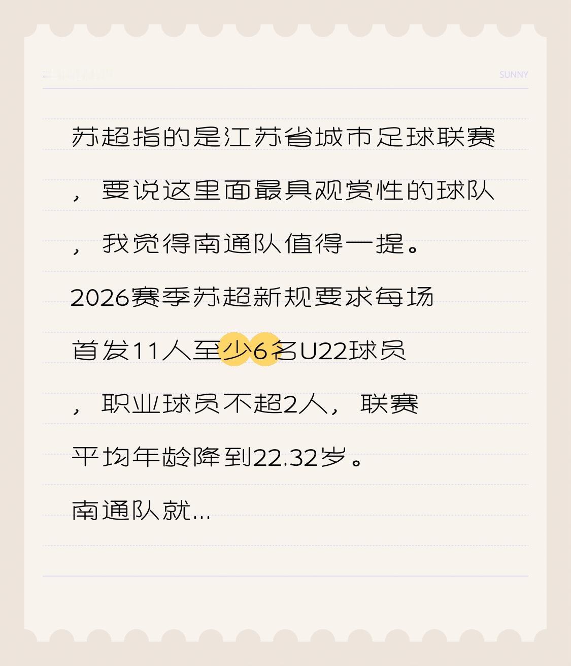 苏超指的是江苏省城市足球联赛,要说这里面最具观赏性的球队,我觉得南通队值得一提。2026赛季苏超新规要求每场首发11人至少6名U22球员,职业球员不超2人,联赛平均年龄降到22.32岁。南通队就像为这规则量身定制,全队平均年龄仅19.8岁,U22球员占比达80%,这得益于珂缔缘、南通支云成熟的青训体系。上赛季他们常规赛不败获亚军,实力强劲。年轻球员充满活力和冲劲,在场上敢打敢拼,进攻时的配合和跑位很有看点,所以南通队比赛观赏性十足。