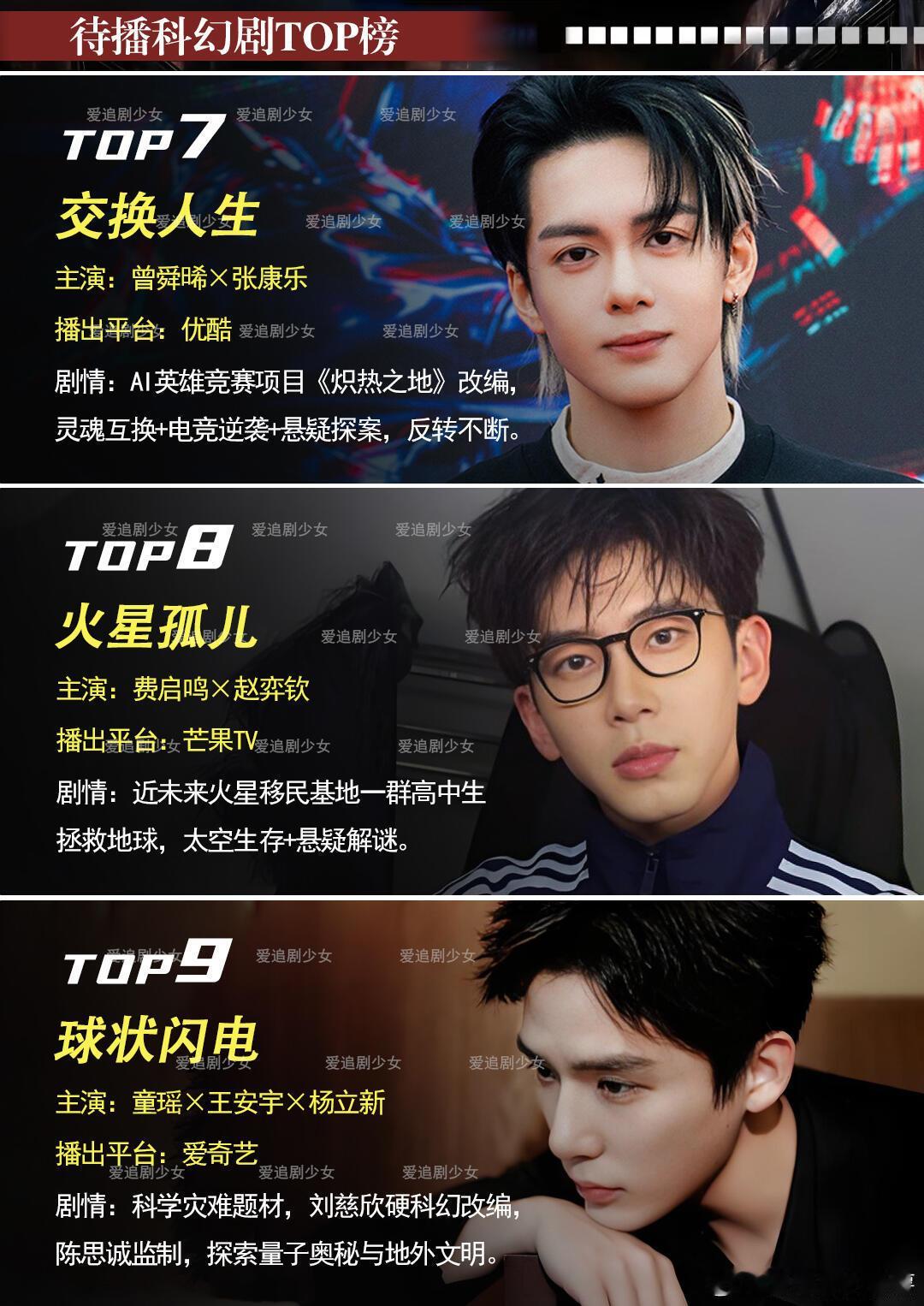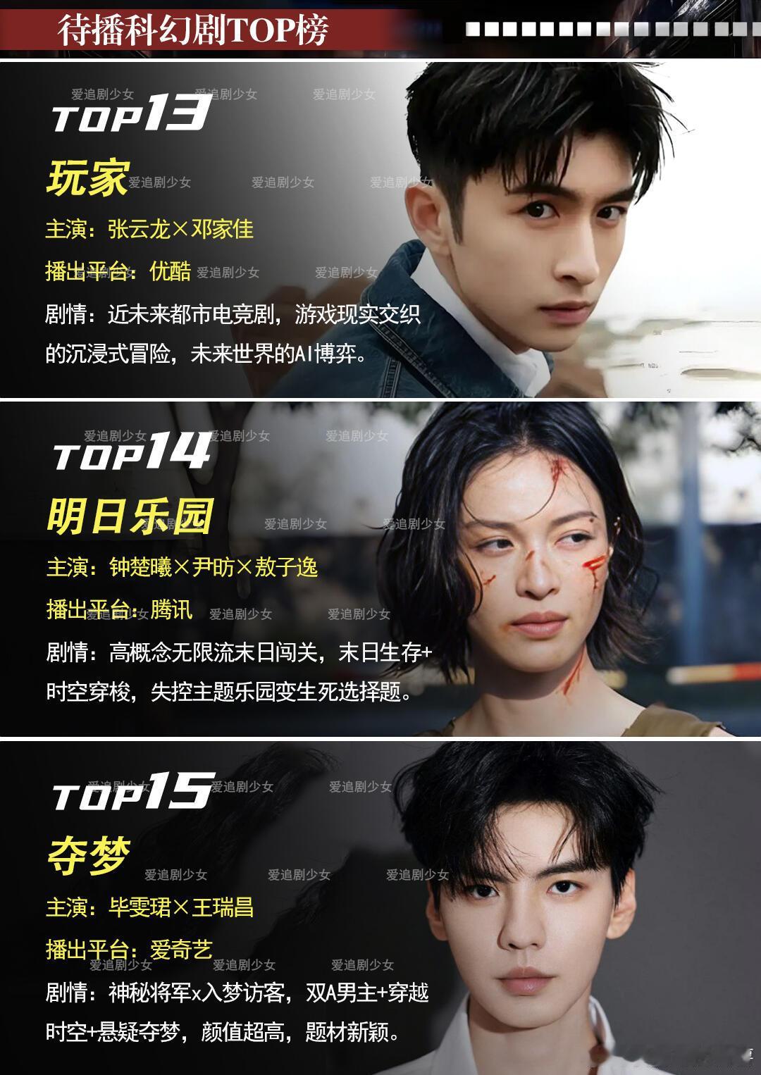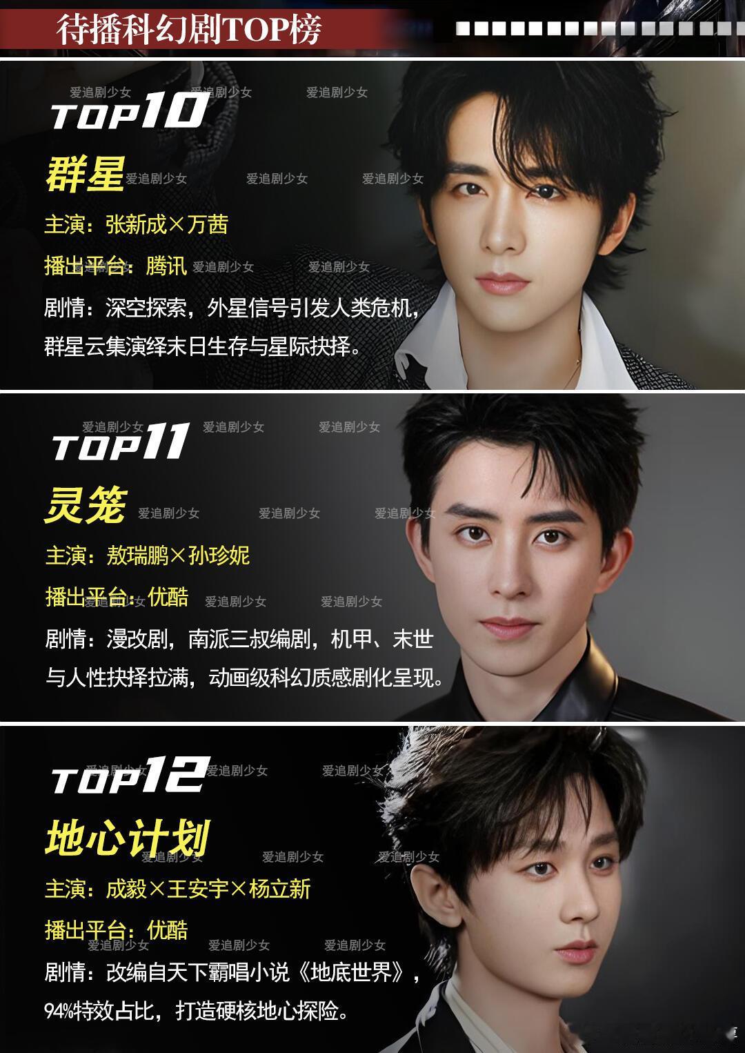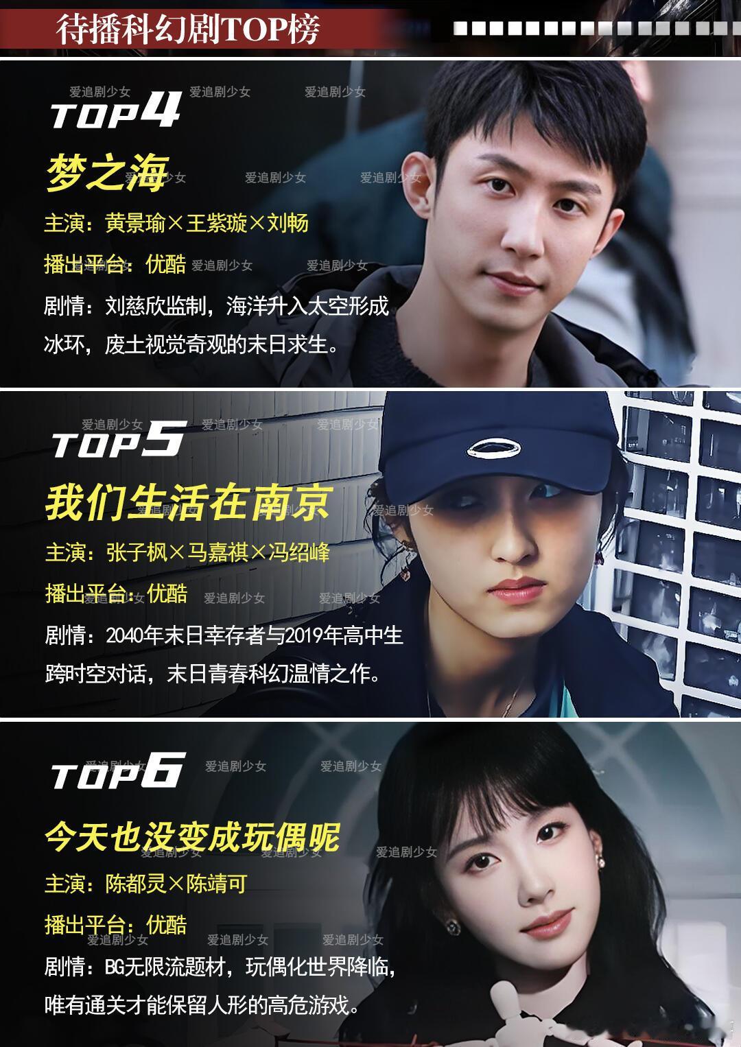 15部待播科幻悬疑剧盘点,肖战十日终焉开机《十日终焉》肖战、魏大勋、胡先煦《三体2:黑暗森林》于和伟、白宇《虽然不能同时拥有一切》迪丽热巴、陈昊森、严屹宽、叶童、朱茵《梦之海》黄景瑜、王紫璇、刘畅《我们生活在南京》张子枫、马嘉祺、冯绍峰、曹炳琨《今天也没变成玩偶呢》陈都灵、陈靖可《交换人生》曾舜晞、张康乐、刘些宁、姜来《火星孤儿》费启鸣、赵弈钦《球状闪电》童瑶、王安宇、杨立新、周一围、王阳《群星》张新成、万茜、严屹宽、尚语贤、李九霄《地心计划》成毅《灵笼》敖瑞鹏、孙珍妮《玩家》张云龙、邓家佳《明日乐园》钟楚曦、尹昉、敖子逸、张雅钦《夺梦》毕雯珺、王瑞昌