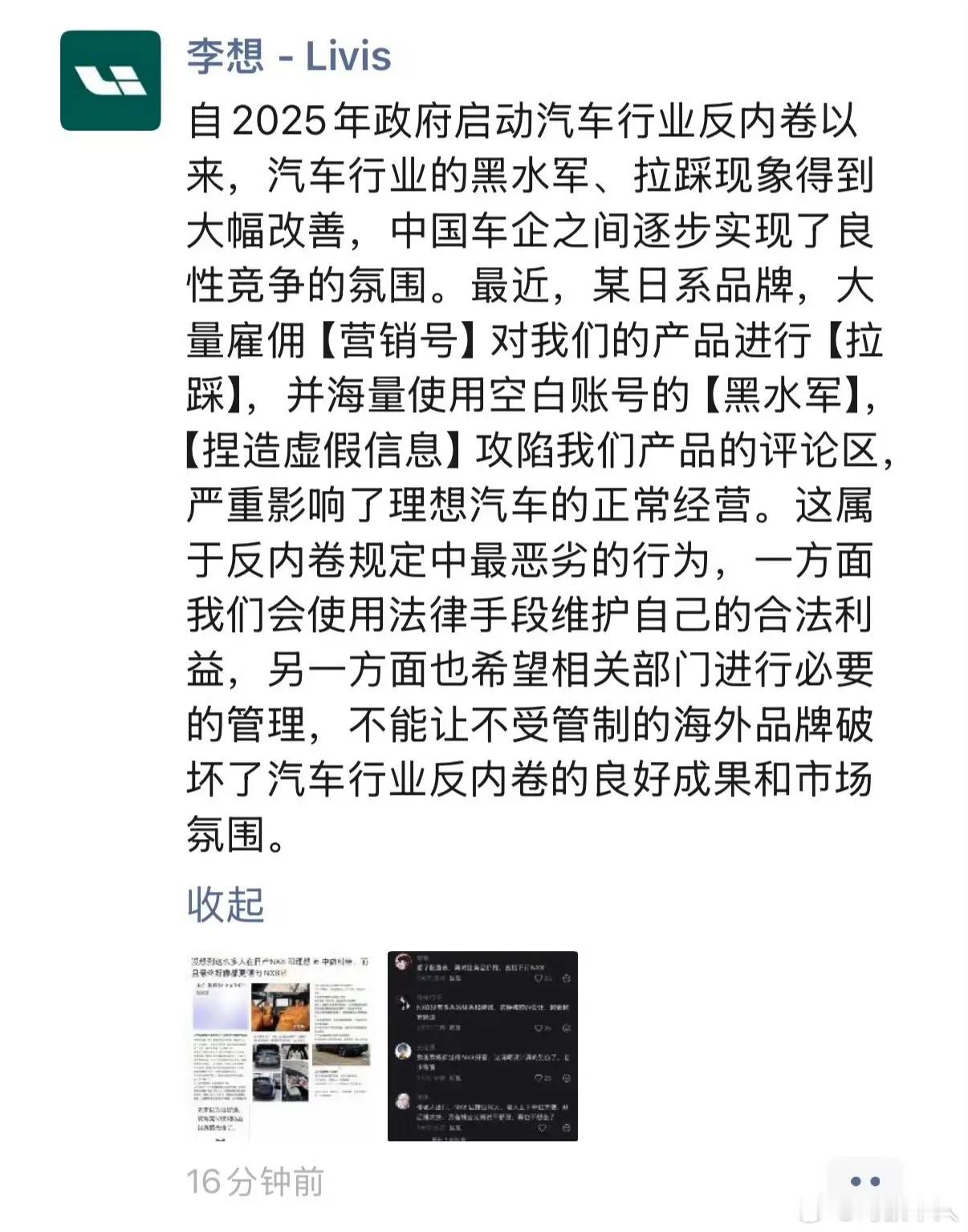 理想汽车东风日产 这个事儿本质还是行业竞争的底线问题,理想法务把东风日产拉踩理想证据曝光 晒出来,日产的回应就显得苍白无力了……大家肯定都明白是怎么回事儿,我觉得车企的宣传就应该有品味一点,宣传自己厉害没问题,但是如果针对性地把别人贬的一文不值就太low了,拉踩是没有下限的,良性竞争就应该是各有各的风格和优势,这里面的逻辑就是你的厉害,我的也不错,就像BBA三家,人家从不会这样,我不会成为你的平替,因为我有我的优势;谁在靠产品说话,谁在走旁门左道,市场和消费者其实看得一清二楚,现在理想有完整证据链选择维权,日产就给自己陷入被动了,宣传没做好,把自己好好的一台新车活在对手的影子里,品牌反而陷入舆情了,所以说这种竞争的底线很重要的。 东风日产高管回应理想汽车东风日产新车发布会曾多次提到理想大v聊车