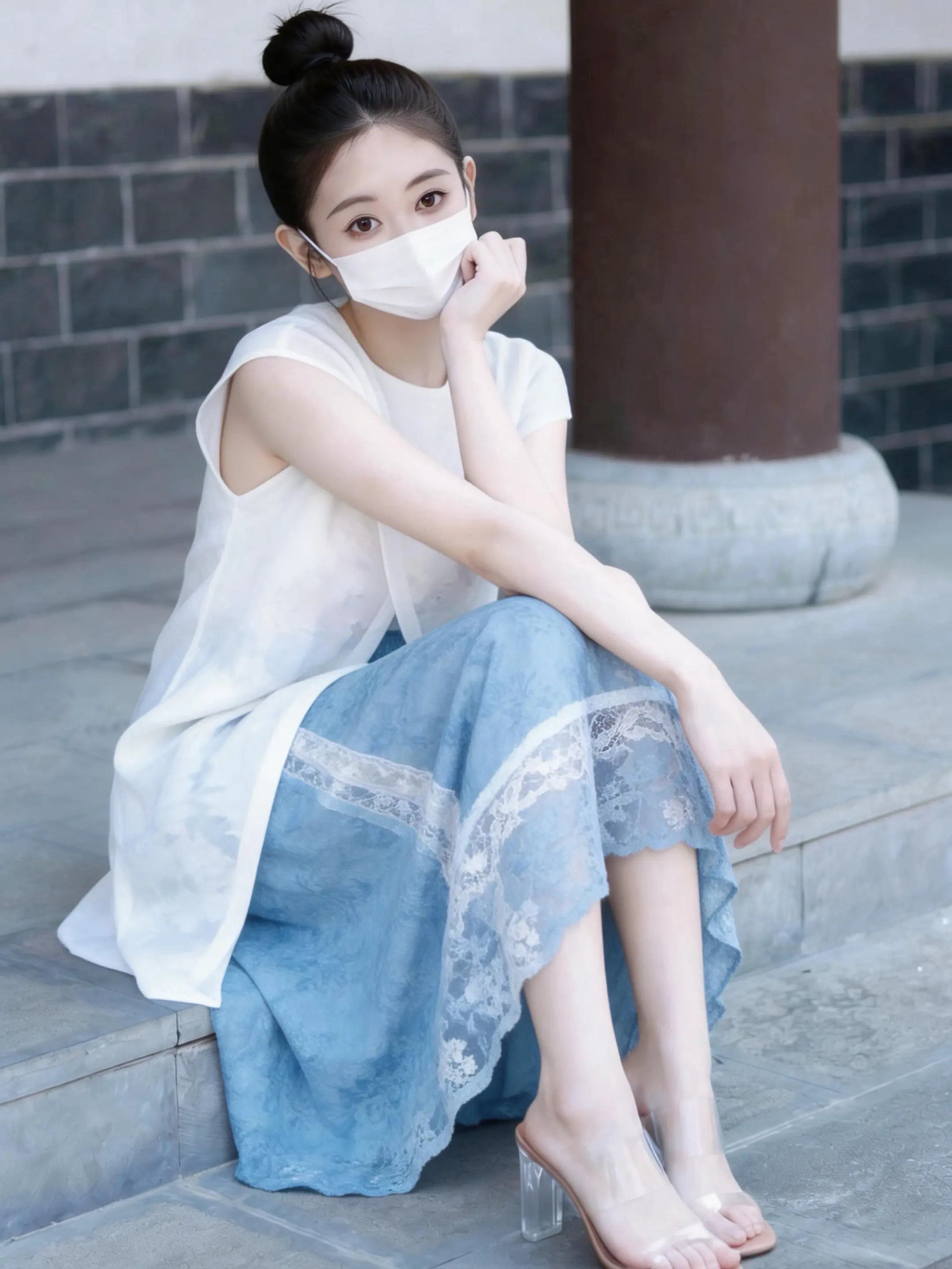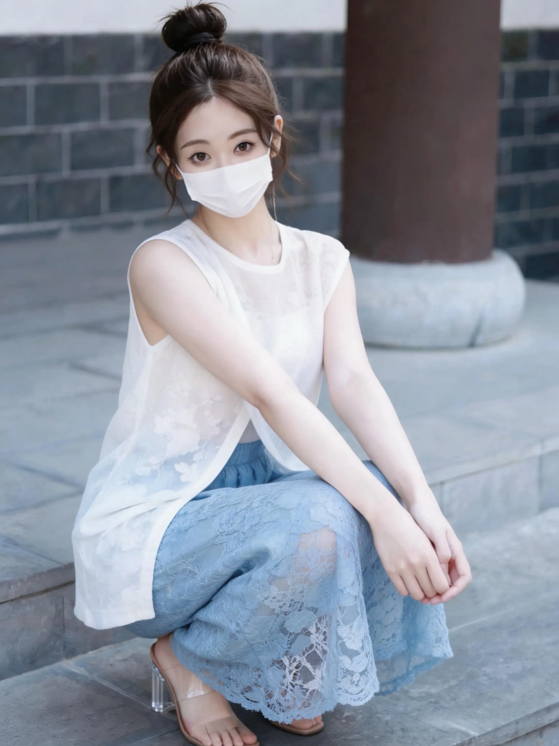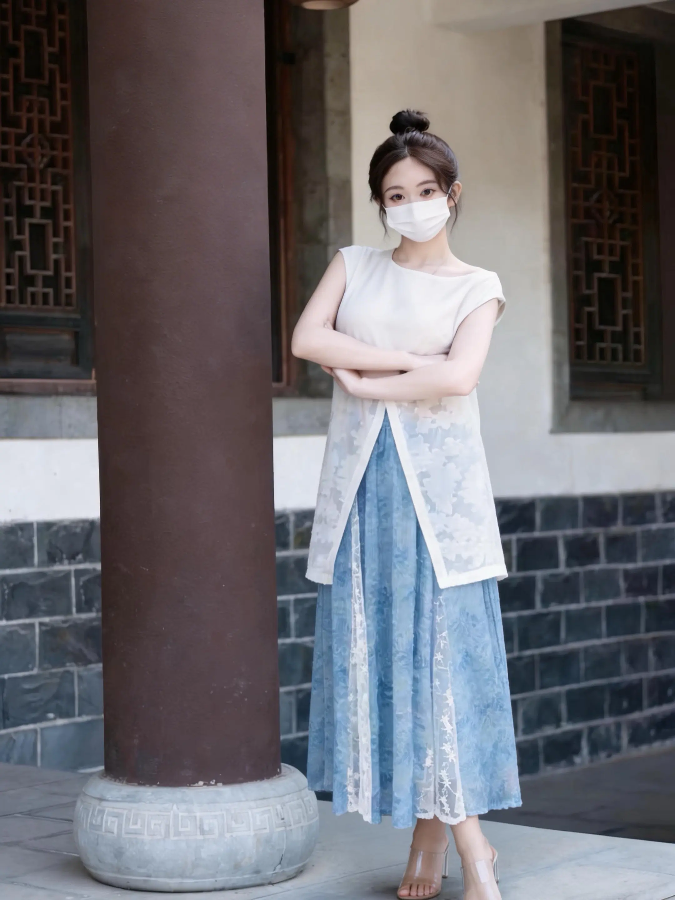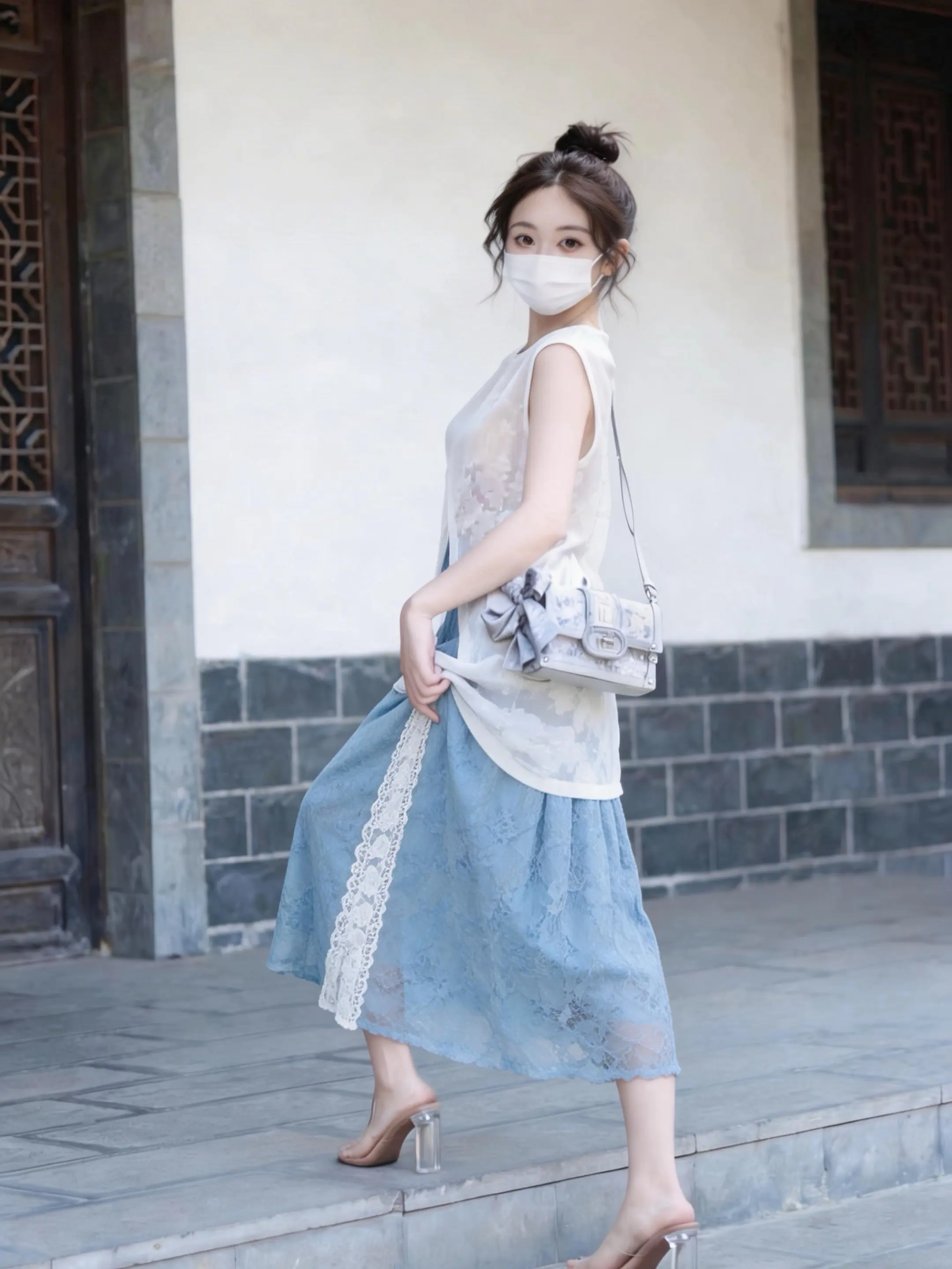 清透提花无袖上衣+蕾丝蓝裙,搭配丸子头,清冷又温柔,像从江南水墨画里走出来的一样~