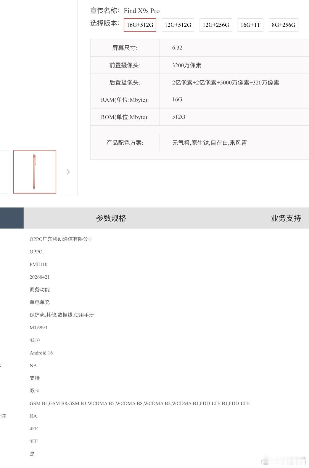 OPPO Find X9s Pro参数