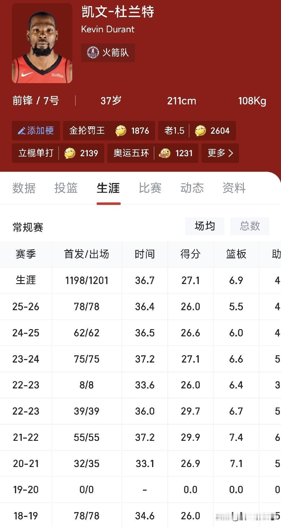 37岁打78场常规赛,杜兰特上一次有这样的出勤率还是他30岁的时候。火箭真算是命好的,现在的杜兰特可比太阳时期和篮网时期的杜兰特健康多了,不声不响赛季总得分又超过了2000,本以为暮年杜兰特是来搭顺风车的,没想到最后还是那根最粗的大腿。