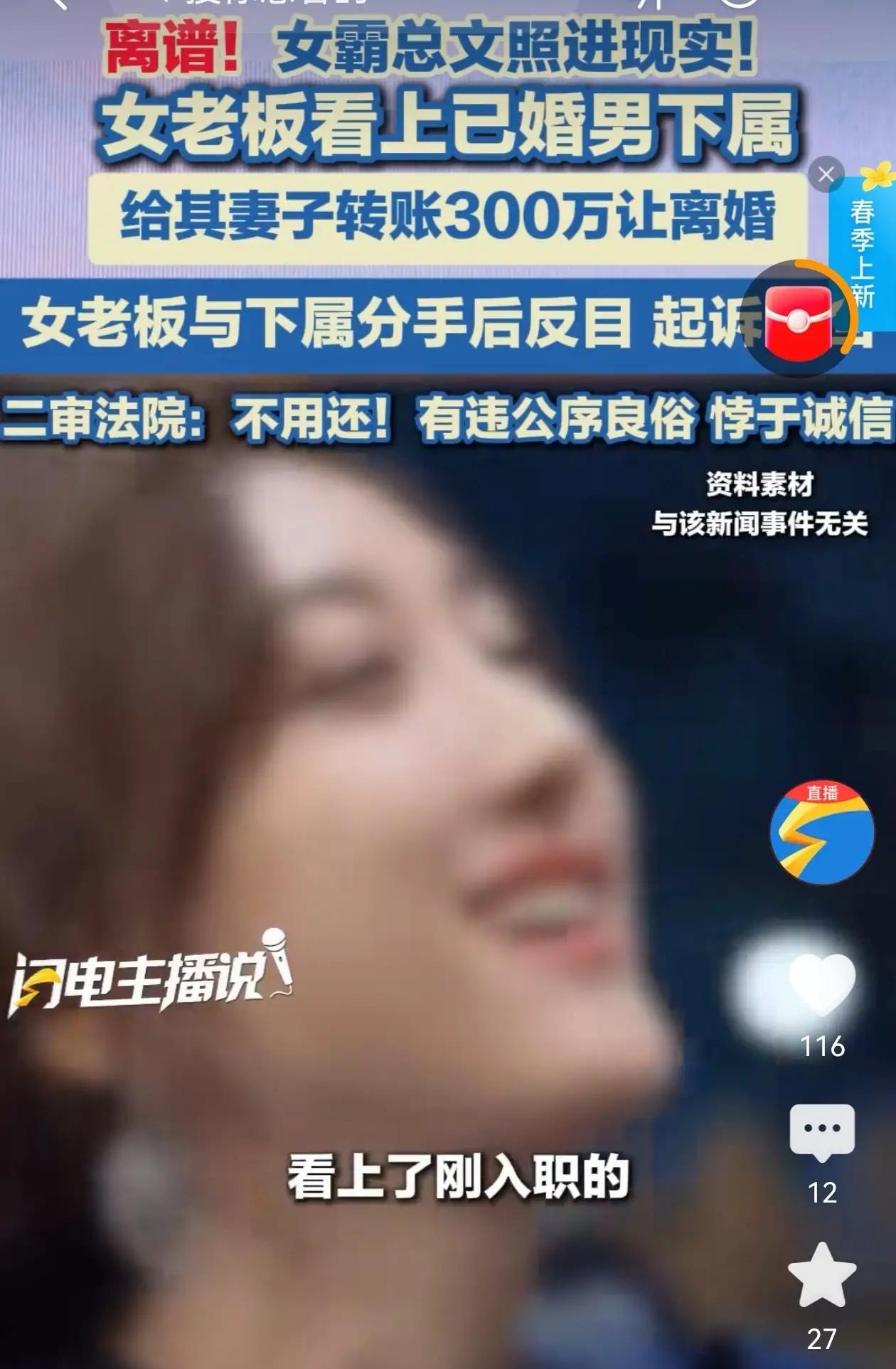 重庆女老板看上已婚男下属,两人婚内出轨、难舍难分,为了光明正大在一起,她豪掷300万甩给男子前妻,逼其离婚让位。本以为是真爱降临,不料同居不久便分道扬镳,恼羞成怒的女老板反手将男子与前妻告上法庭,一审判决前妻返还300万,二审却直接反转,结局令人直呼解气。