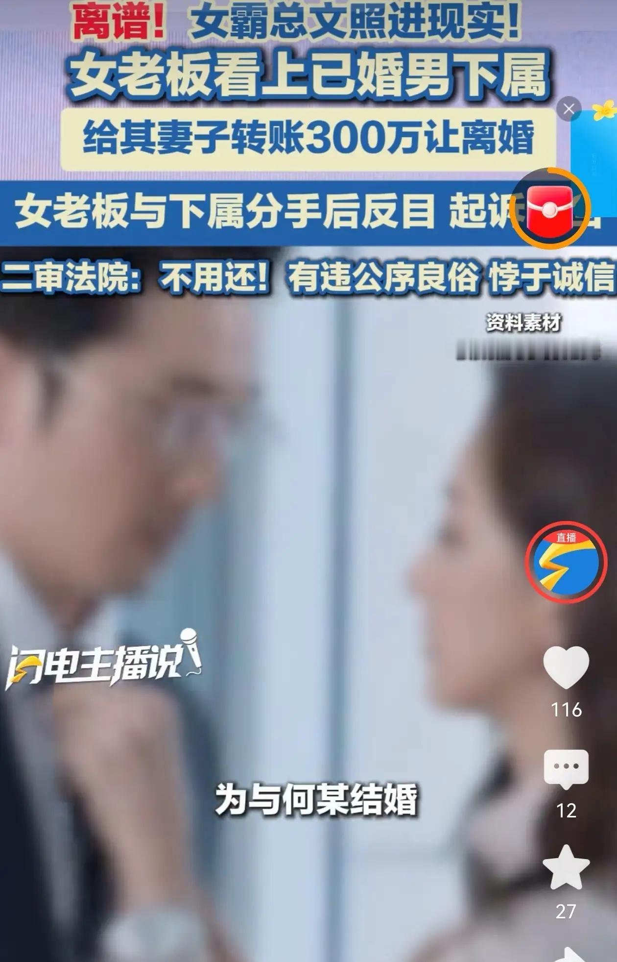 就在众人以为女老板能如愿拿回钱财时,二审迎来惊天逆转。法院审理查明,300万并非女老板对前妻的无偿赠与,而是代男下属支付的离婚补偿与子女抚养费。女老板明知对方已婚,仍主动插足婚姻、出资促成离婚,如今因感情破裂反悔索钱,既违背诚信原则,也不符合法律规定。最终二审撤销一审判决,驳回女老板全部诉求,300万一分不退。