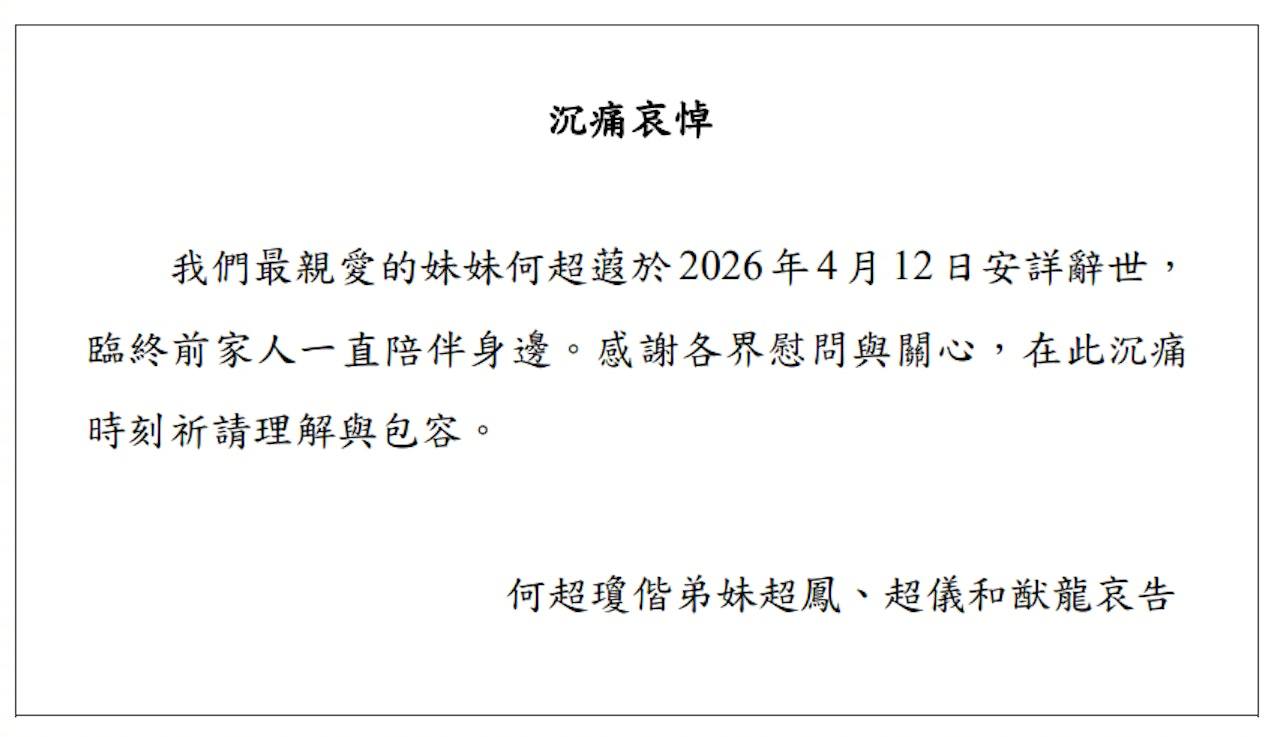 【何鸿燊女儿何超蕸去世】据香港01等港媒4月12日报道,“赌王”何鸿燊女儿、信德集团执行董事何超蕸今日逝世,临终前家人陪伴在侧。由何超蕸出任执行董事的信德集团,沉痛哀悼何超蕸逝世,并附上家人通告。何超蕸去世