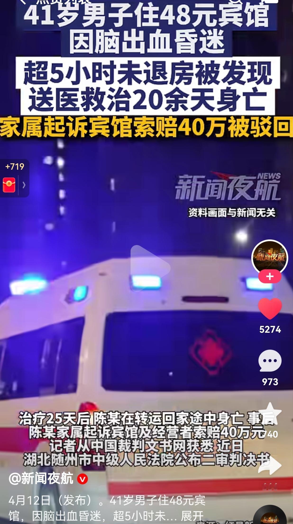 41岁男子住48块钱的廉价宾馆突发脑出血,超时5小时没退房才被发现,送医20多天后身亡,家属反手起诉宾馆要40万赔偿,结果法院一审判不赔,二审直接驳回!这事儿一出,全网直接吵成了两派!