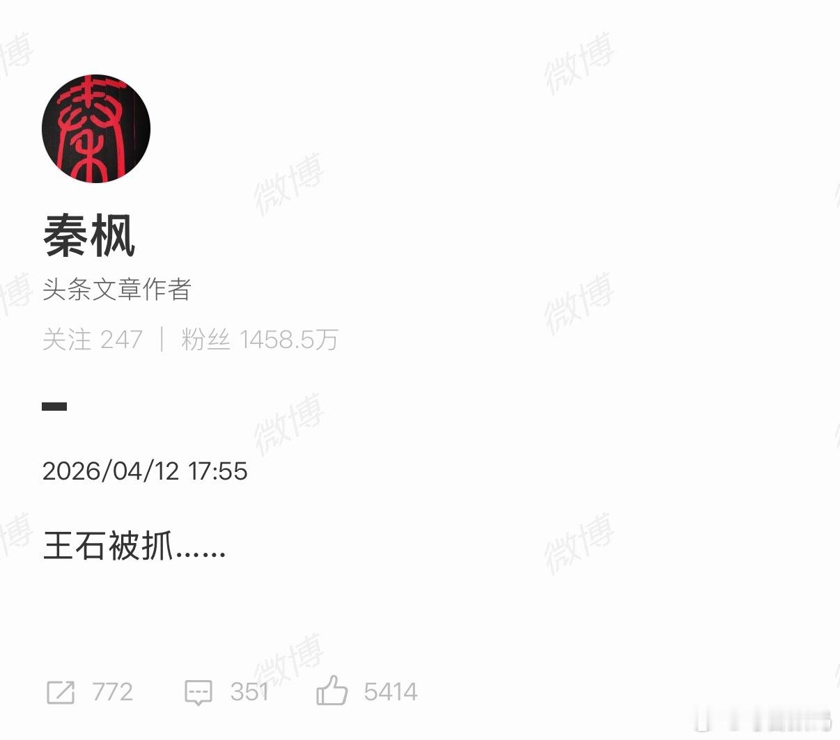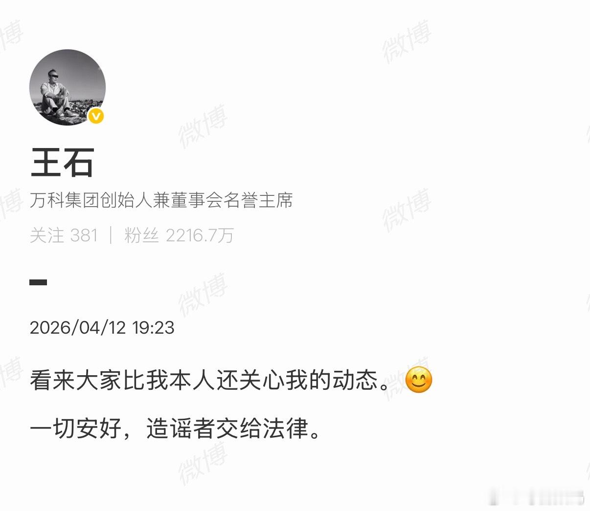 王石否认被抓秦枫说王石被抓了,王石光速辟谣,一切安好,是谣言