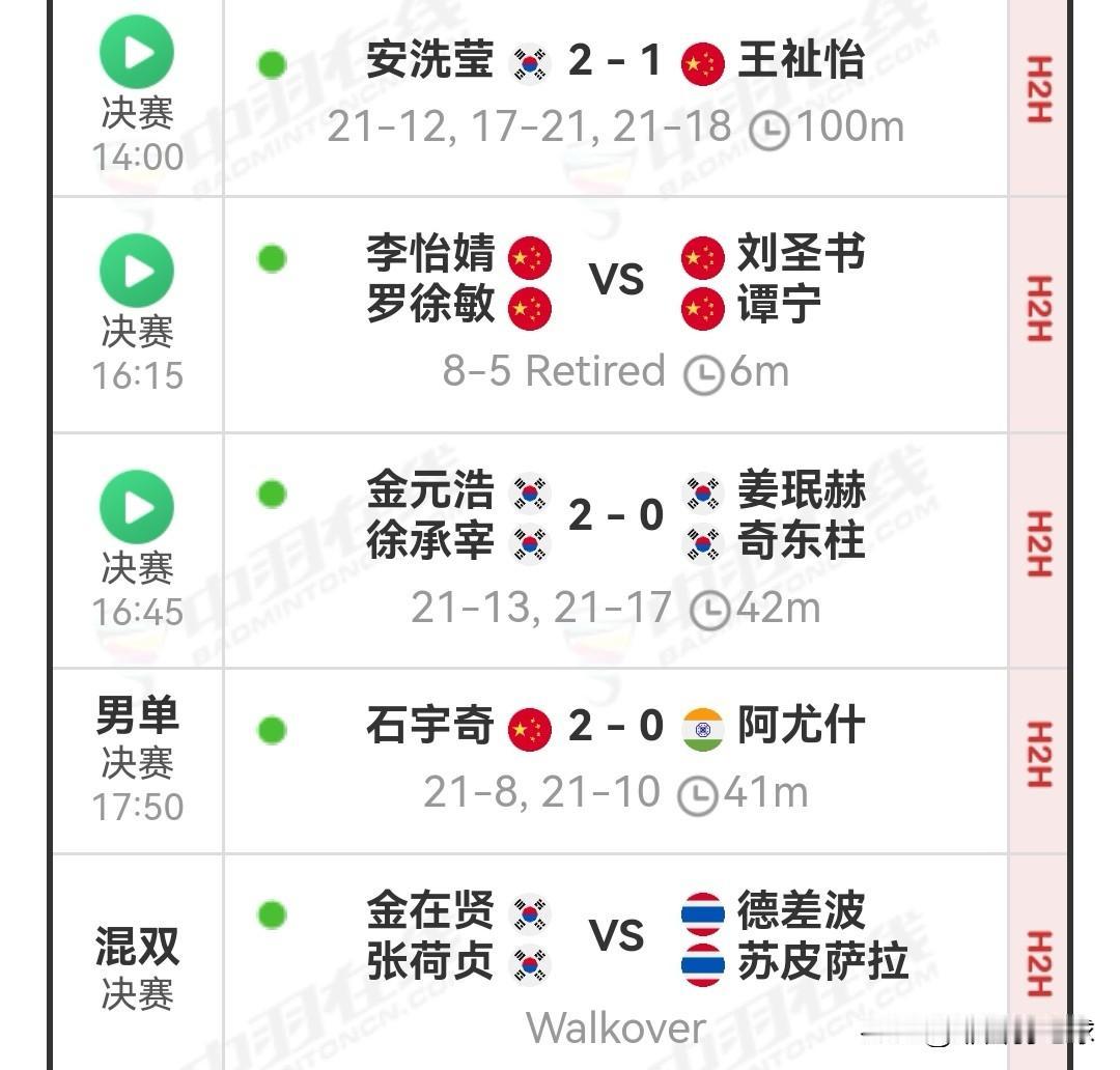 卫冕冠军圣谭组合开赛不久便因伤退赛,其队友李怡婧/罗徐敏首次夺得亚锦赛女双冠军。