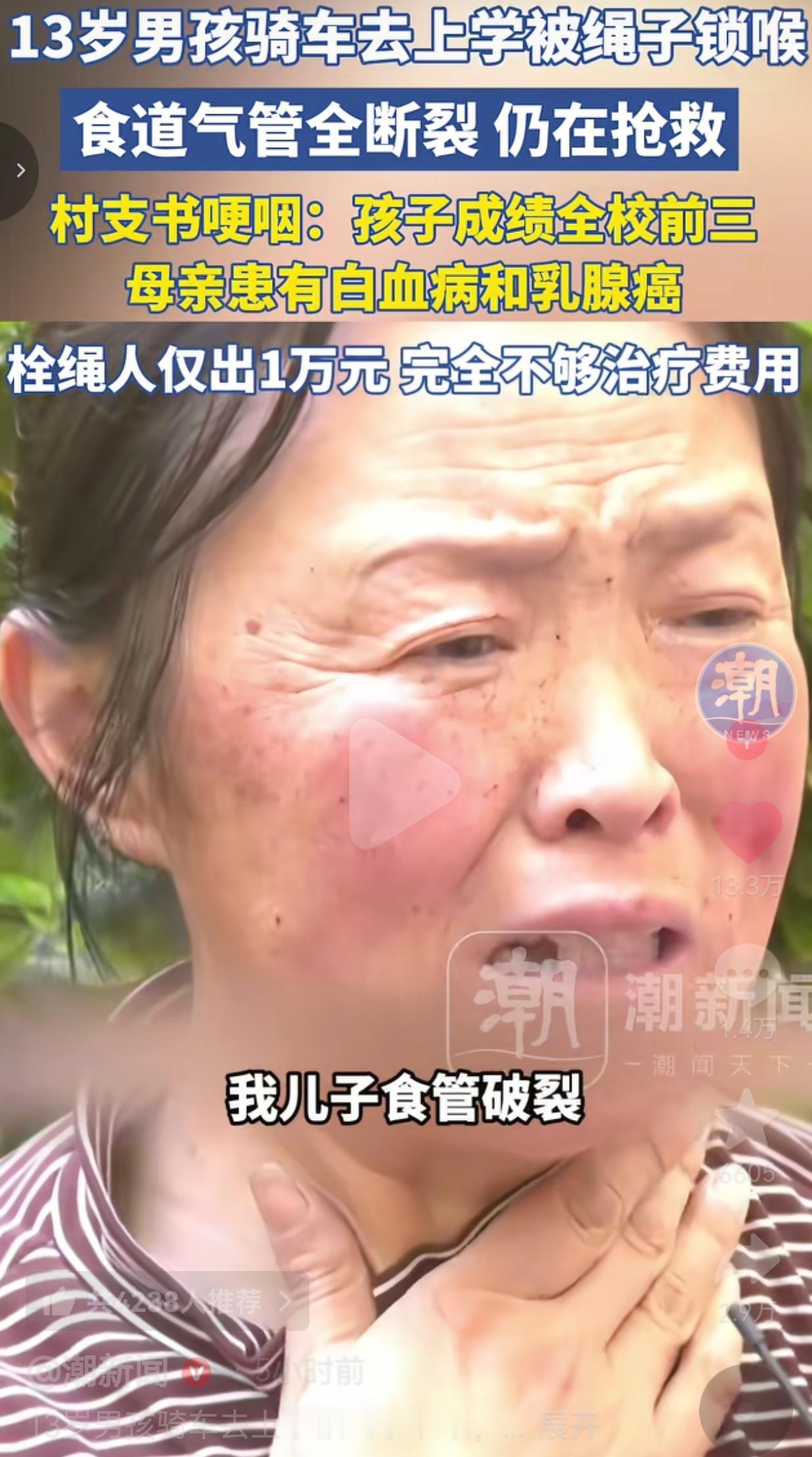 当天中午,13岁的男孩骑着自行车,正常上学路过村道。绳子直接勒住了他的脖子!