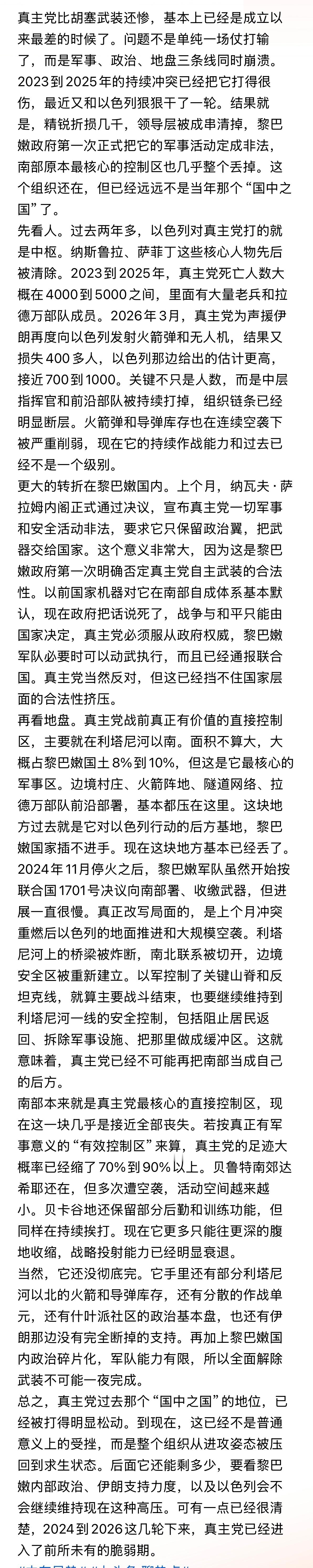 未来中东百年将无战争。…2024到2026这几轮下来,真主党已经进入了前所未有的脆弱期。。。