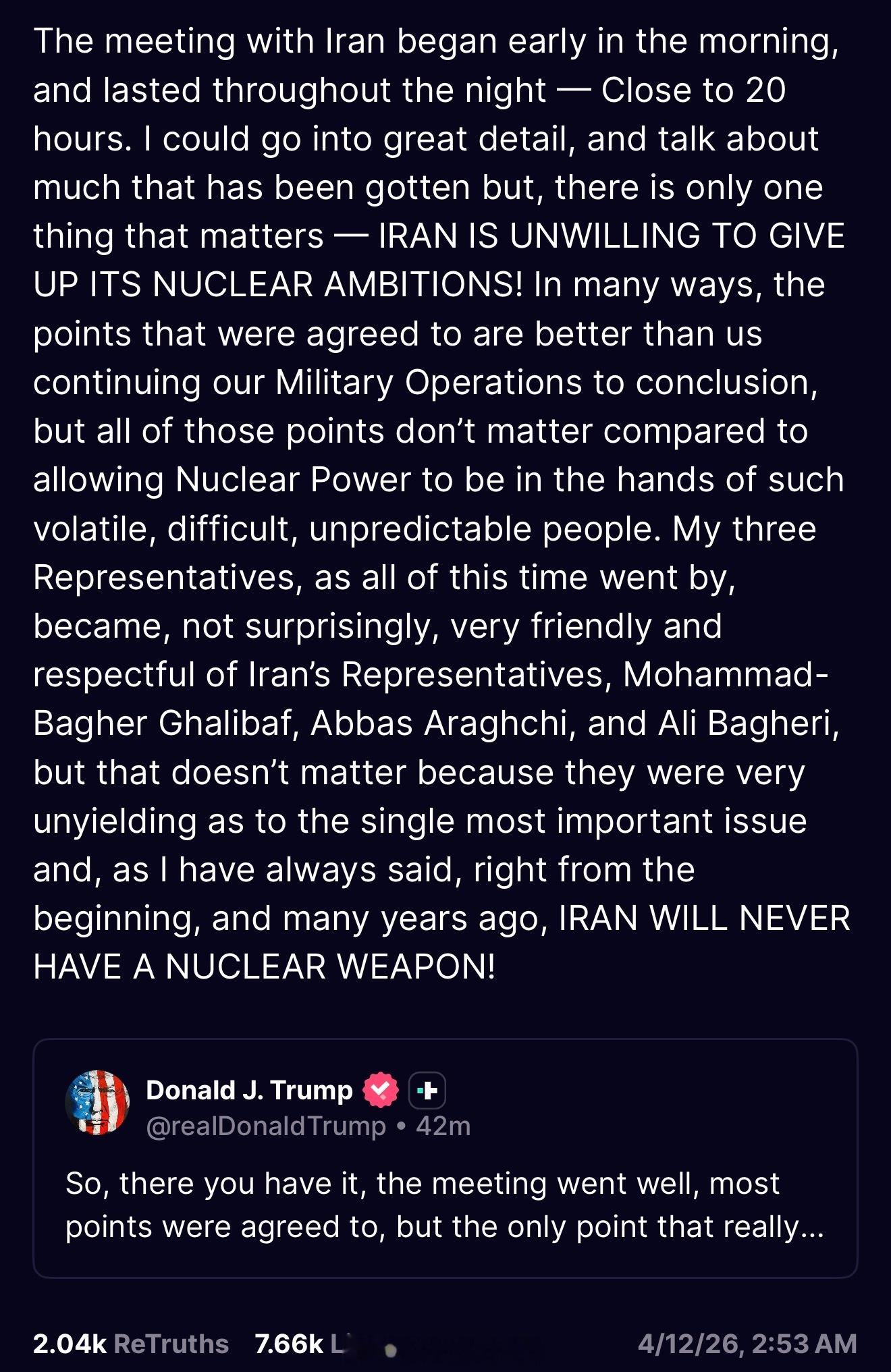 在这将近 20 个小时里,我的三位代表:和伊朗代表 Mohammad-Bagher Ghalibaf、Abbas Araghchi、Ali Bagheri相处得越来越友好,彼此也保持了充分尊重,这并不令人意外。但这些都不重要,因为在最关键、也是唯一真正关键的问题上,他们始终寸步不让。