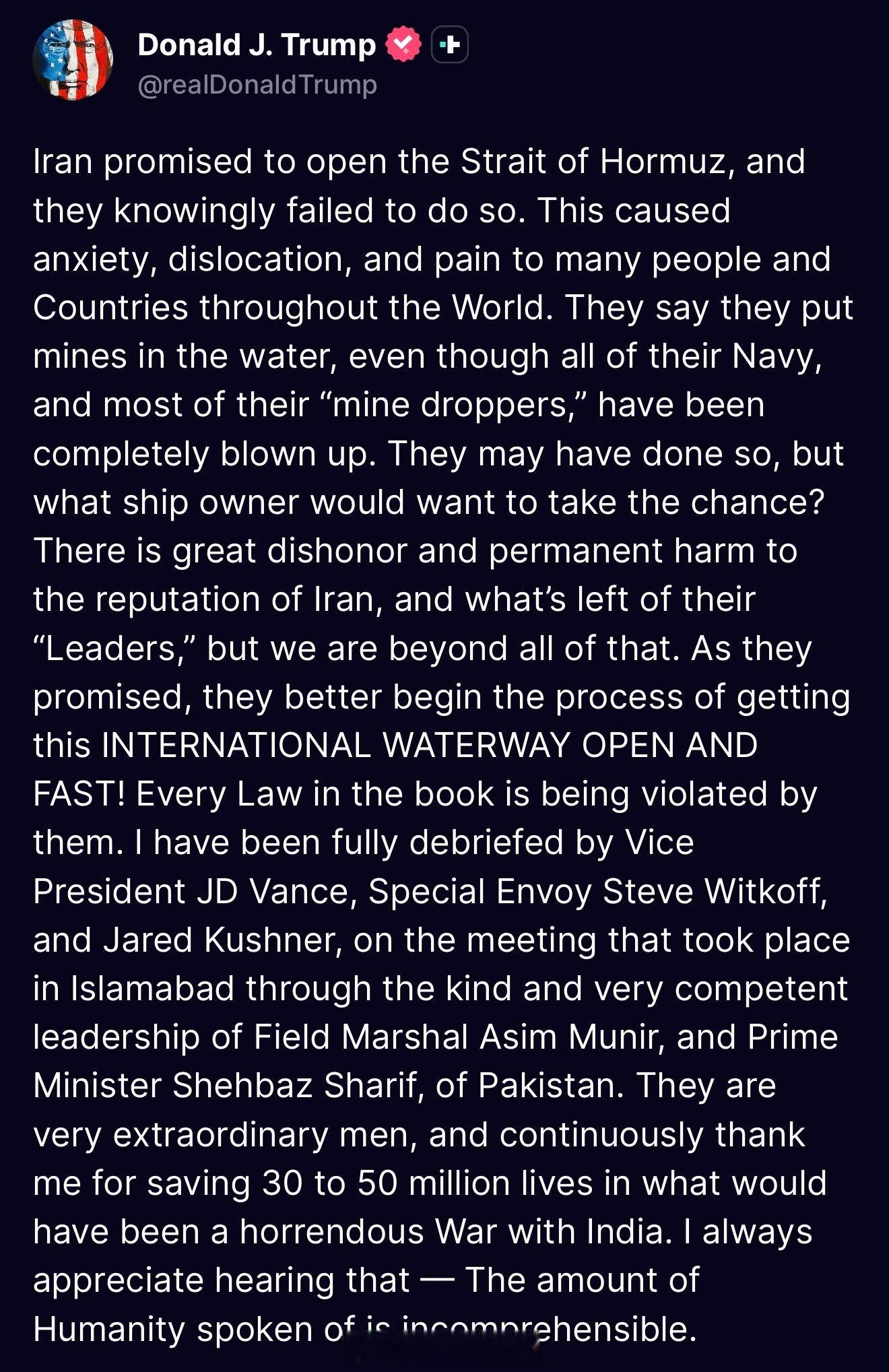 副总统JD Vance、特使Steve Witkoff,以及Jared Kushner,已经就伊斯兰堡举行的会谈向我做了完整汇报。这场会谈能够举行,离不开巴基斯坦陆军元帅Asim Munir和总理Shehbaz Sharif善意而且极其高效的领导。他们都是非常杰出的人,也不断向我表达感谢,称我避免了一场原本可能与印度爆发的惨烈战争,拯救了3000万到5000万人的生命。每次听到这种话,我都非常感慨,其中体现出的人道意义,几乎难以用语言形容。