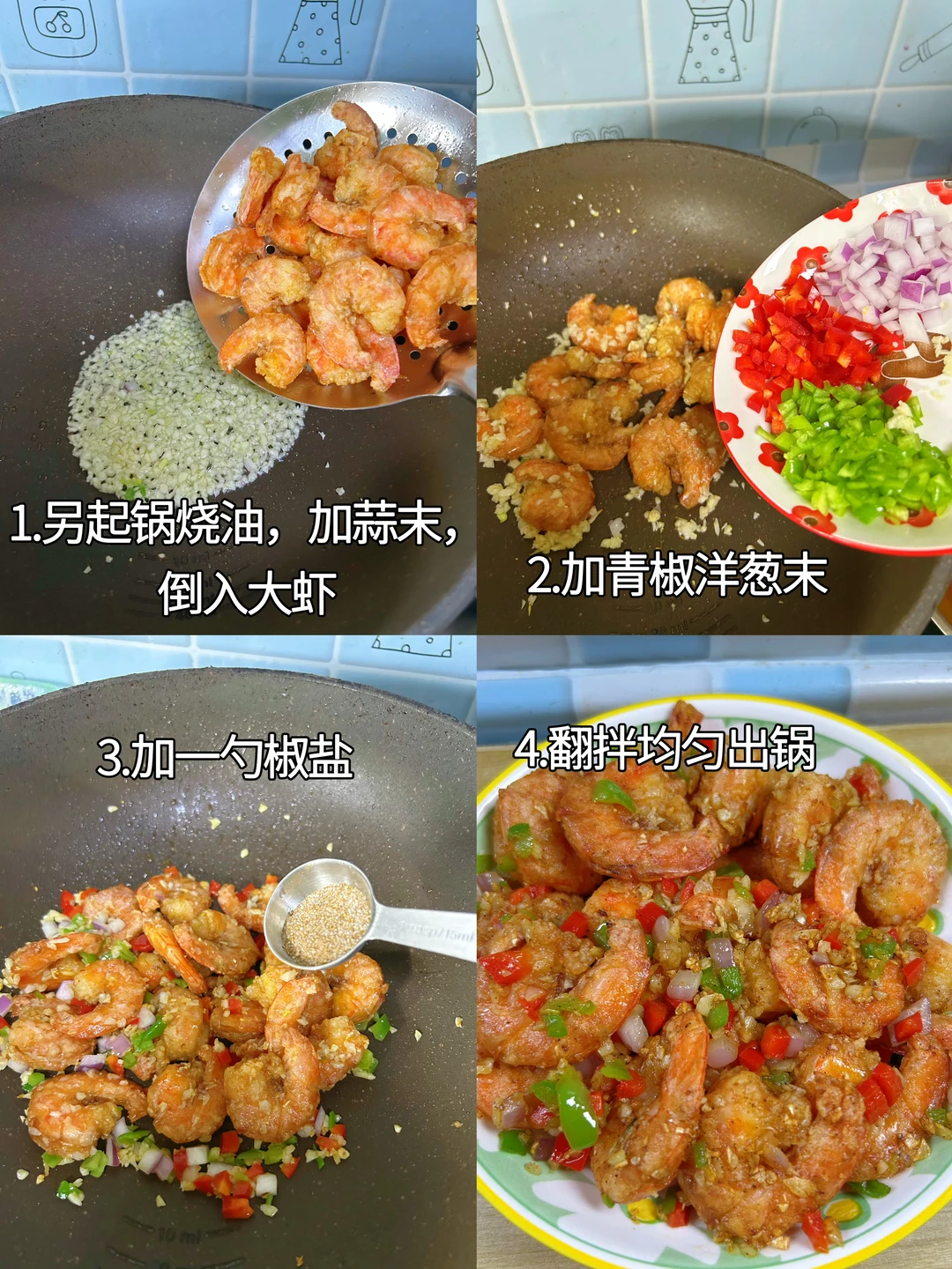 5.另起锅烧少许油,加蒜末爆香,倒入大虾,倒入青红椒和洋葱末,一小勺椒盐,翻拌均匀出锅。