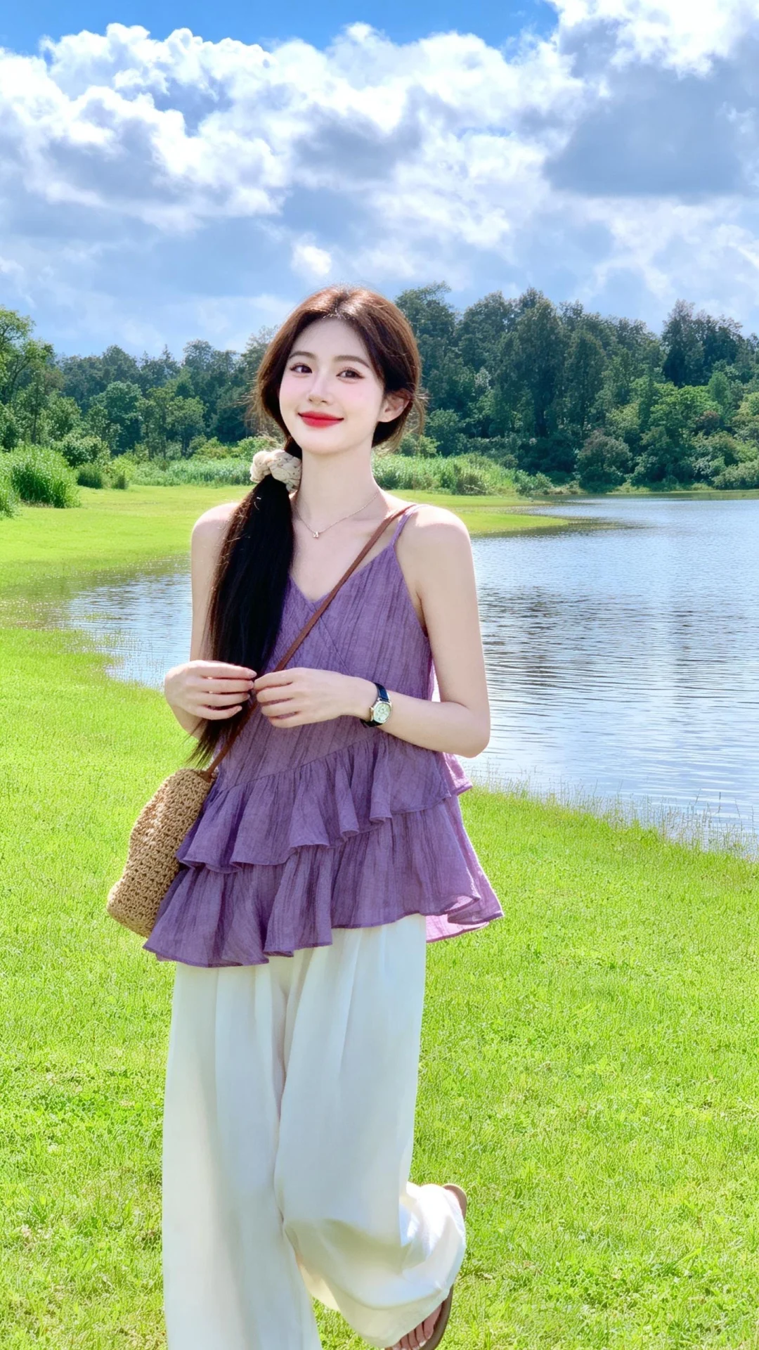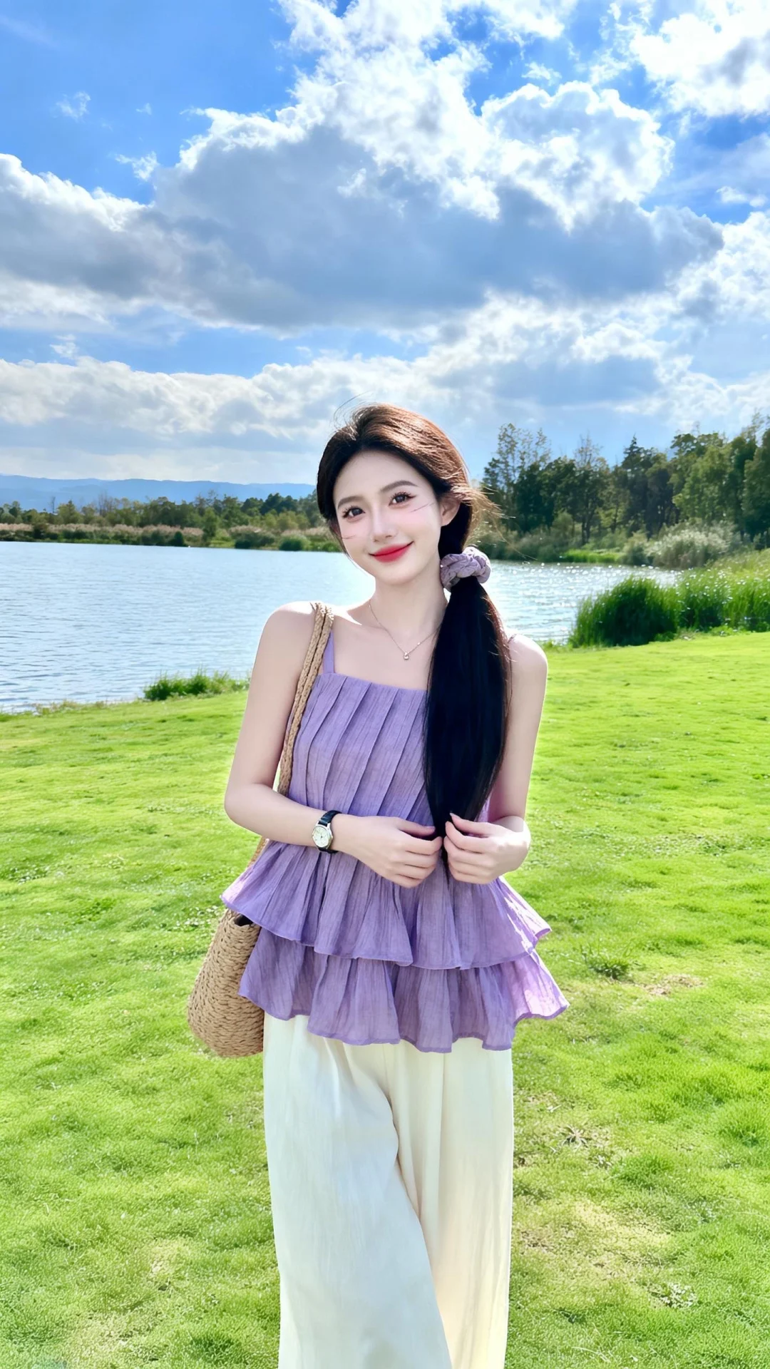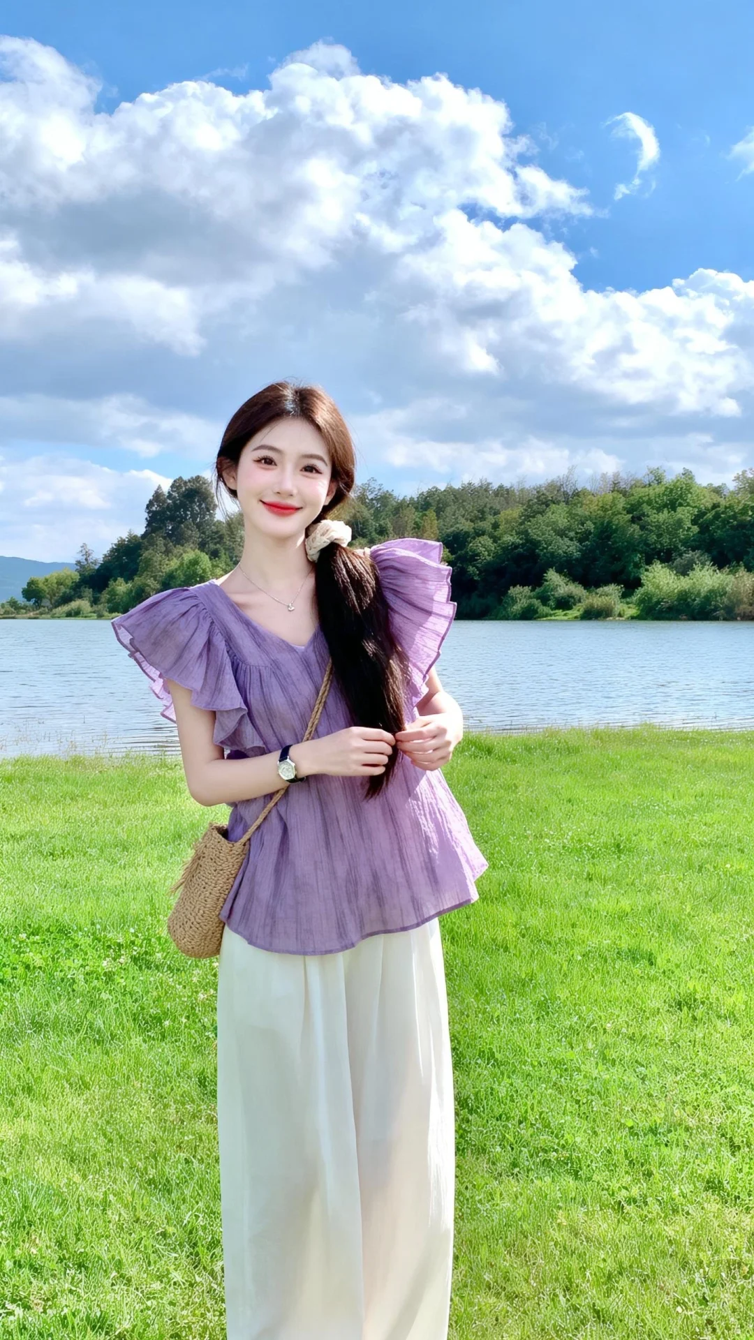 日常生活快照,随手一拍,采用中景构图,以平视的摄影视角呈现。冷白皮甜美萌妹,高颜值,瓷白肌肤水润光泽,少女感网拍,网感妆容,精致五官,超长头发韩系御姐,一束长发用发圈束好垂于身前,阳光洒脸,光影自然。头部微侧,活波可爱,表情愉悦,身穿身穿紫色棉麻几道斜向超大荷叶边小衫,浅白色宽松拖地裤,佩戴细项链、手表,斜挎草编包,无帽子、头饰、耳环、细手环等。处于户外草地场景,有大片绿色草地,远处是树木和植被,天空多云,光线明亮。比例 3:4换湖边背景天空高清蓝天白云一位漂亮的亚洲女生,大眼睛双眼皮,大方得体,端庄,自信,绝美容貌,长长的睫毛,微红的嘴唇,柳眉纤细,眼眸深情深邃,悬胆鼻,女子五官、妆容精致,皮肤白皙,年轻貌美,完美身材,比例协调,神情温柔羞怯,每一处细节都仿佛是经过时光雕琢的艺术品。随机动作,可爱表情,如同静谧的湖水,超高清细节,整体光线亮白,真人真实写真风格,真实场景。超清晰摄影大师用光。超广角镜头,远景,全身照,有氛围感,超精细,细节丰富,色彩丰富多彩,超高清画质32k,摄影作品。