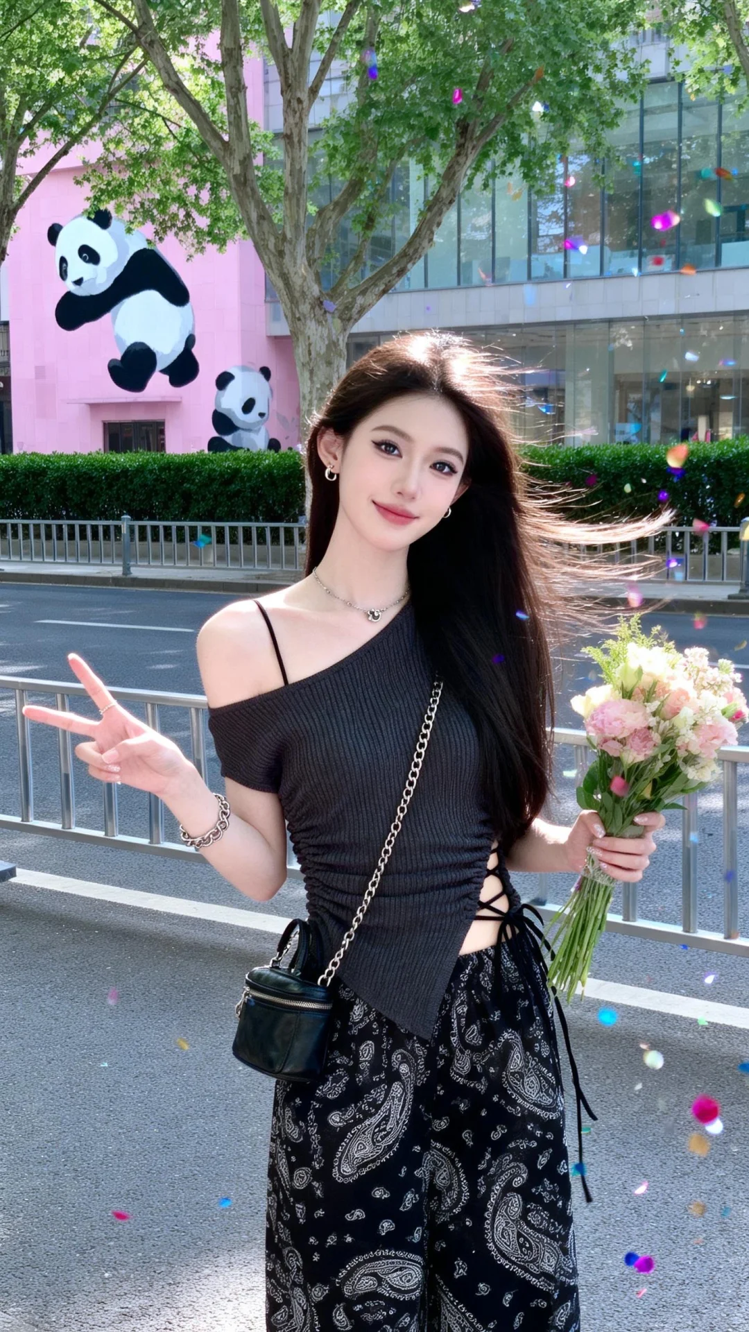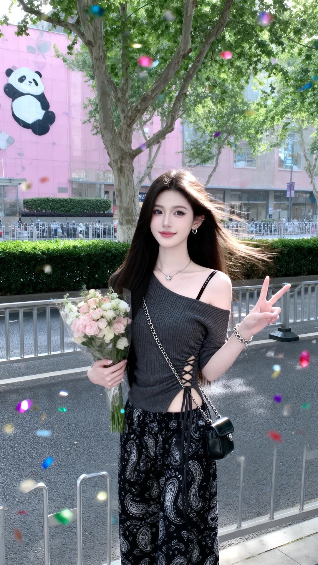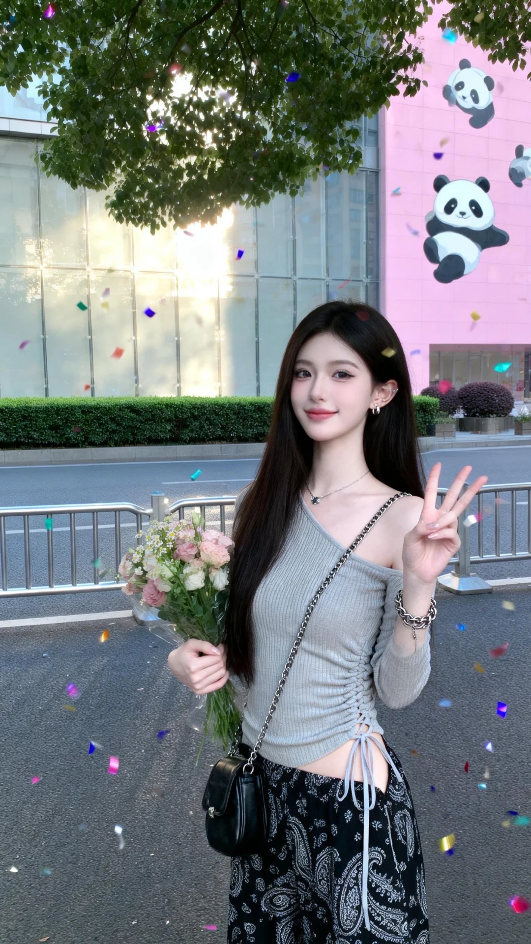 背景为商圈临街区域:身后是深灰色柏油马路,路边是简约的银色金属护栏,护栏外是修剪整齐的绿篱灌木,几棵高大的行道树(枝叶繁茂)遮挡了部分天空,右侧是粉色的建筑外墙有熊猫涂鸦,阳光从侧面洒来,在玻璃上泛着柔和的反光。画面延续日常随手拍的风格,色调清爽,玻璃质感突出,还原商圈逛街后在临街玻璃前打卡自拍的热门场景,,拍摄一名女生,一位长发及腰、可爱的女生,身着上衣(核心单品)