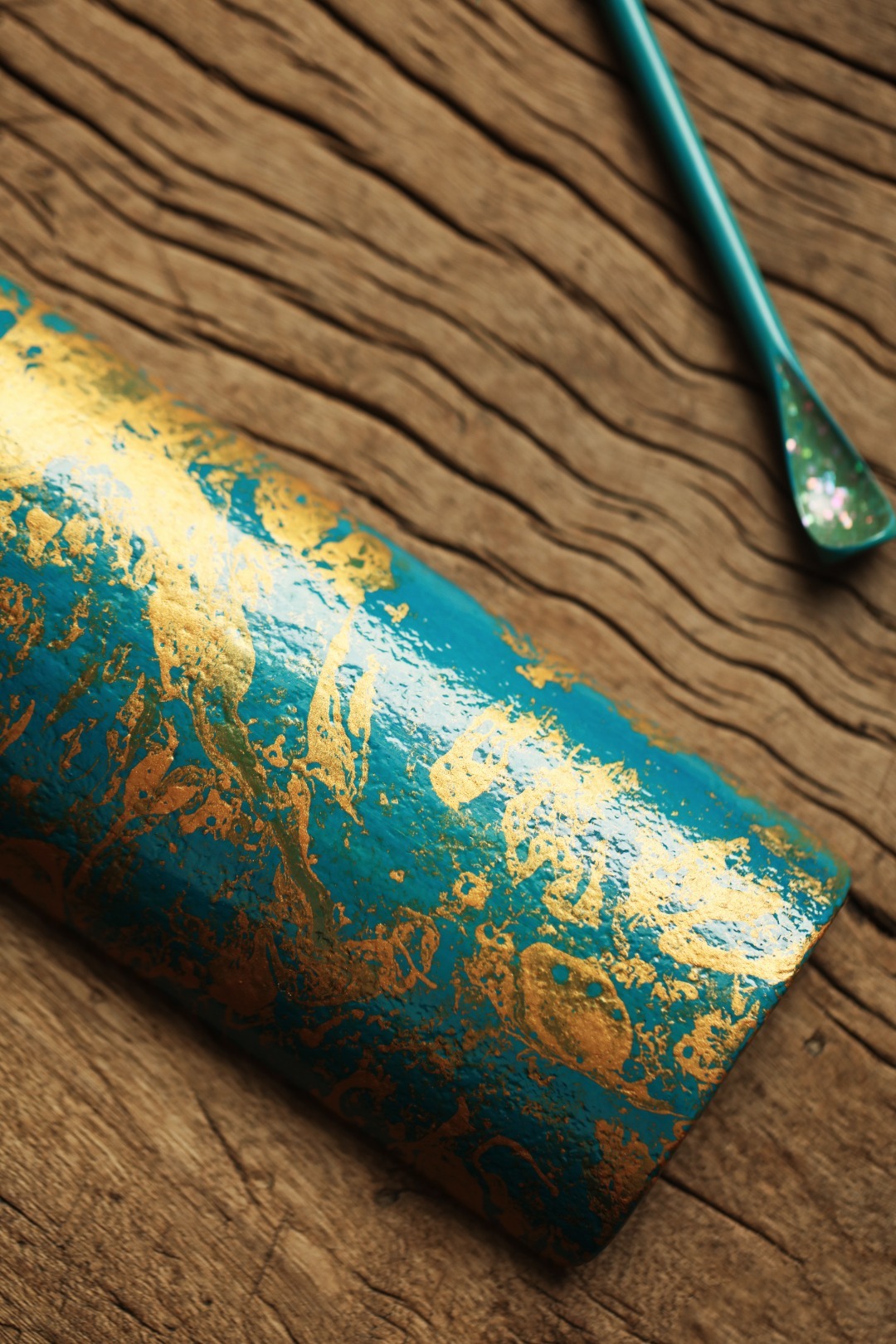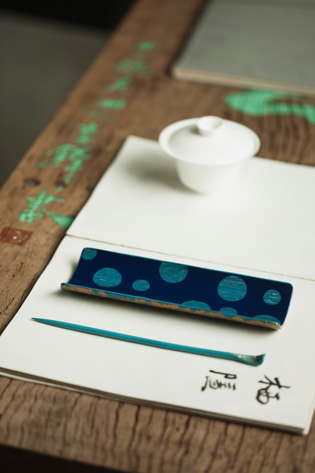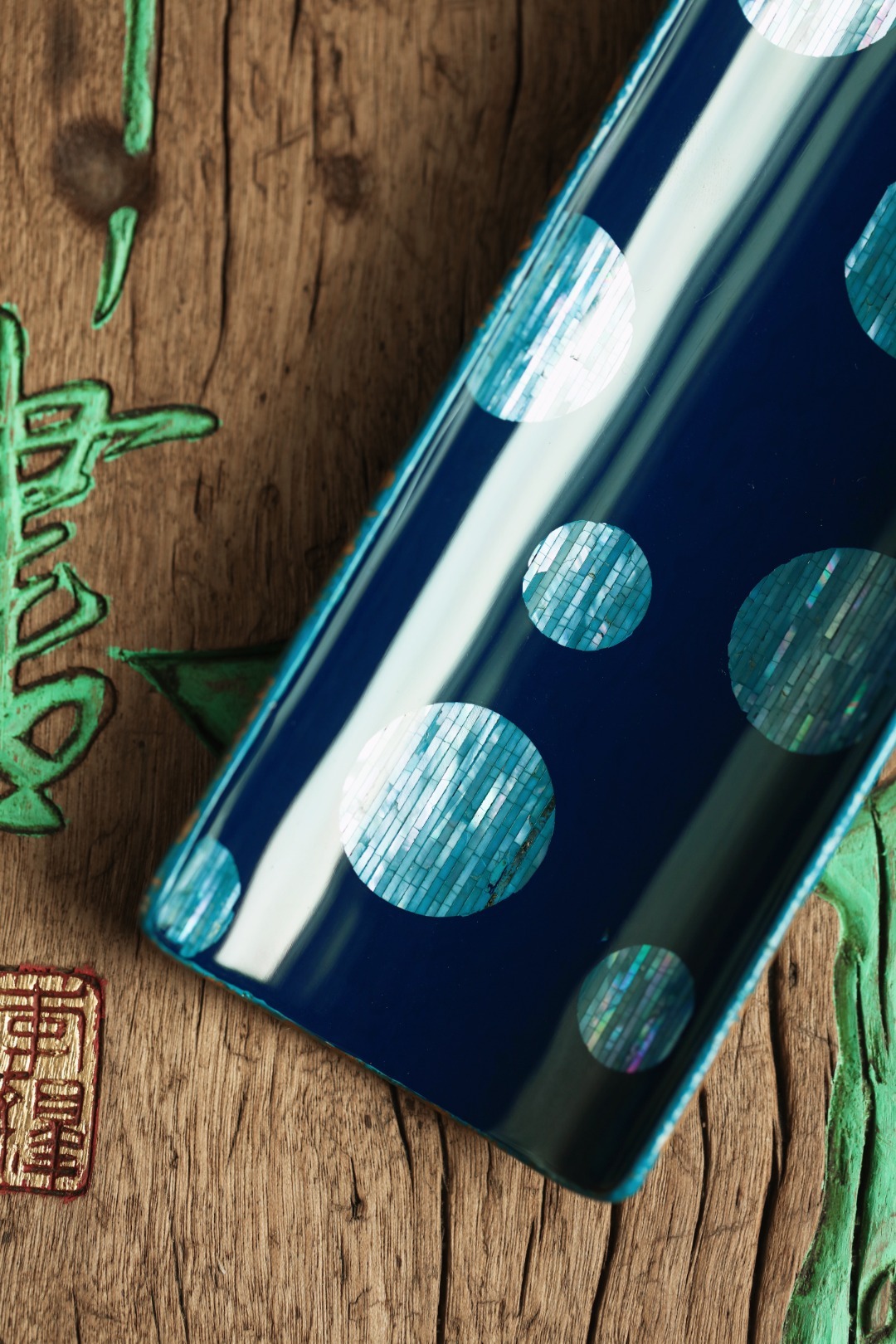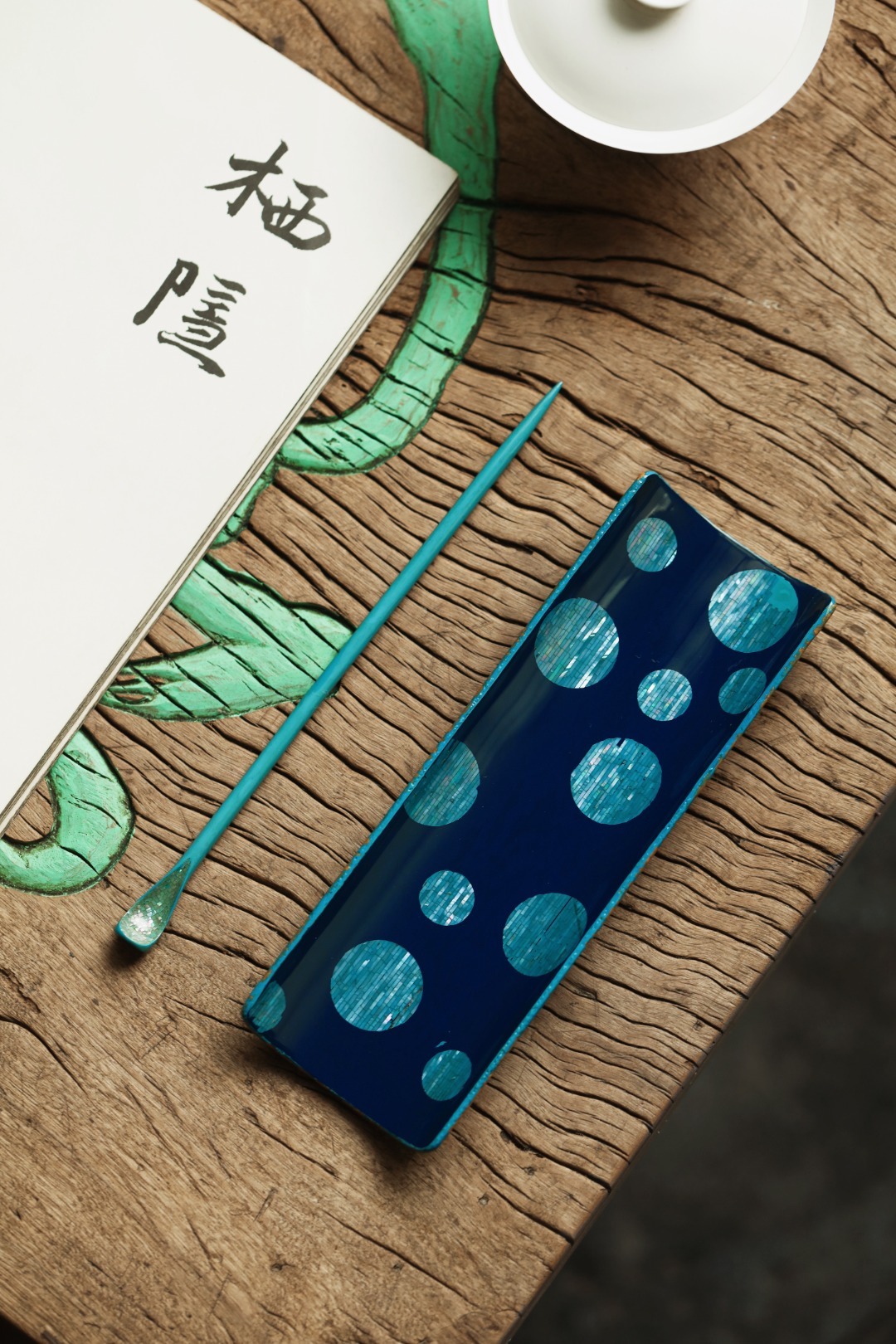 循传统工艺,逐层髹漆,斑斓多彩,宛若星空,手工镶嵌螺钿,反复推光打磨,触手温润细腻。入茶席之间,辅以茶事,百观不厌。