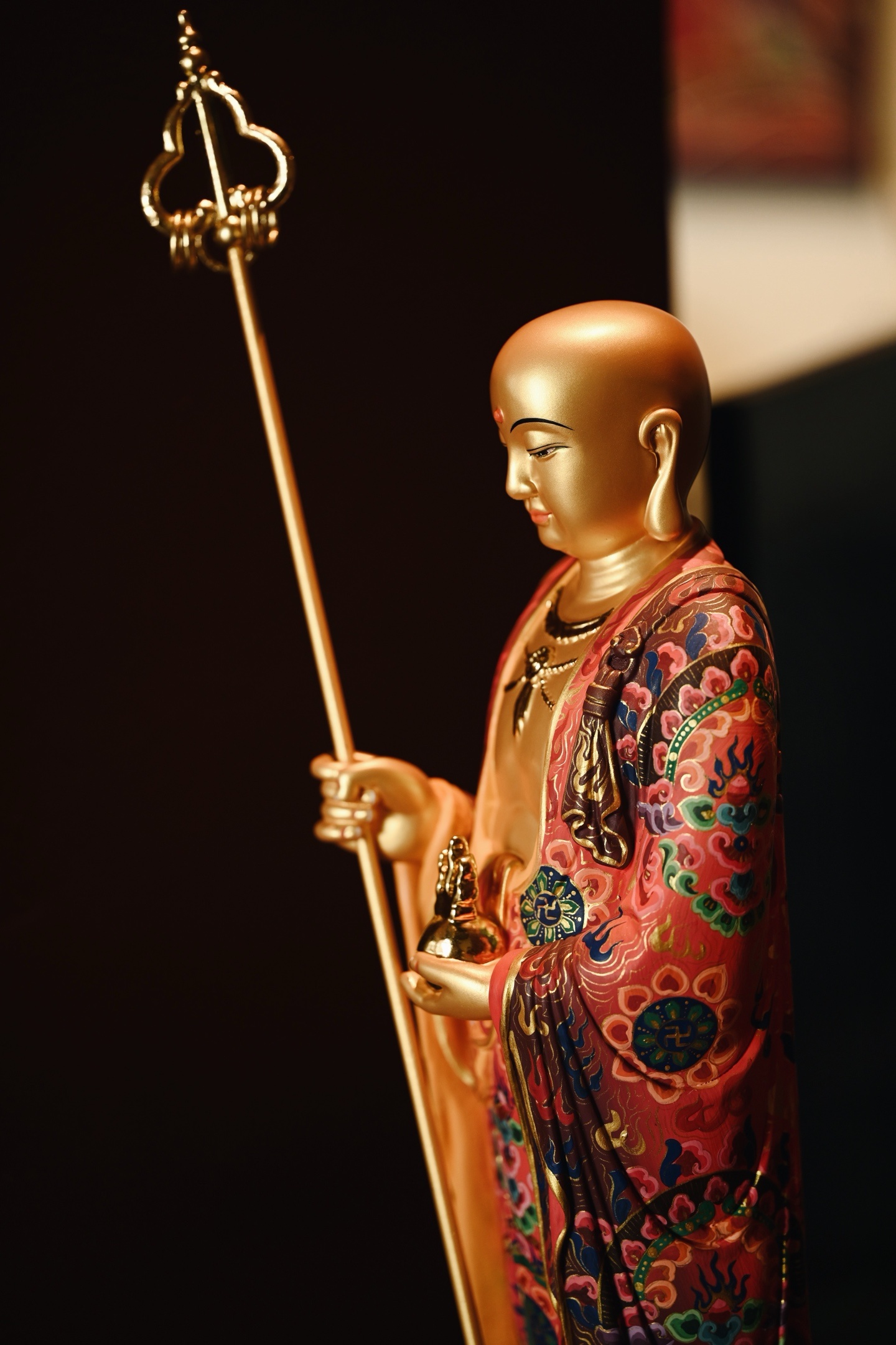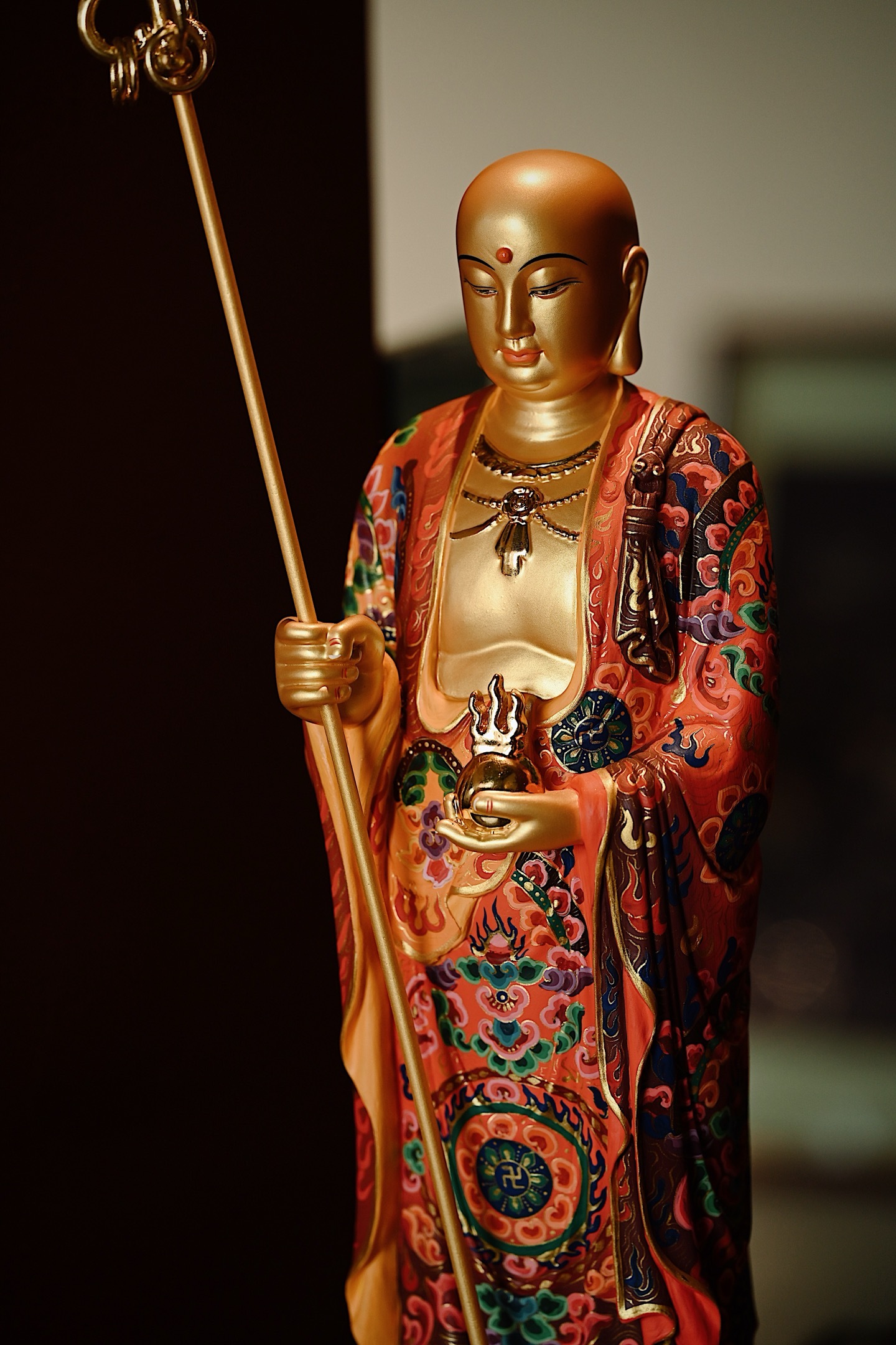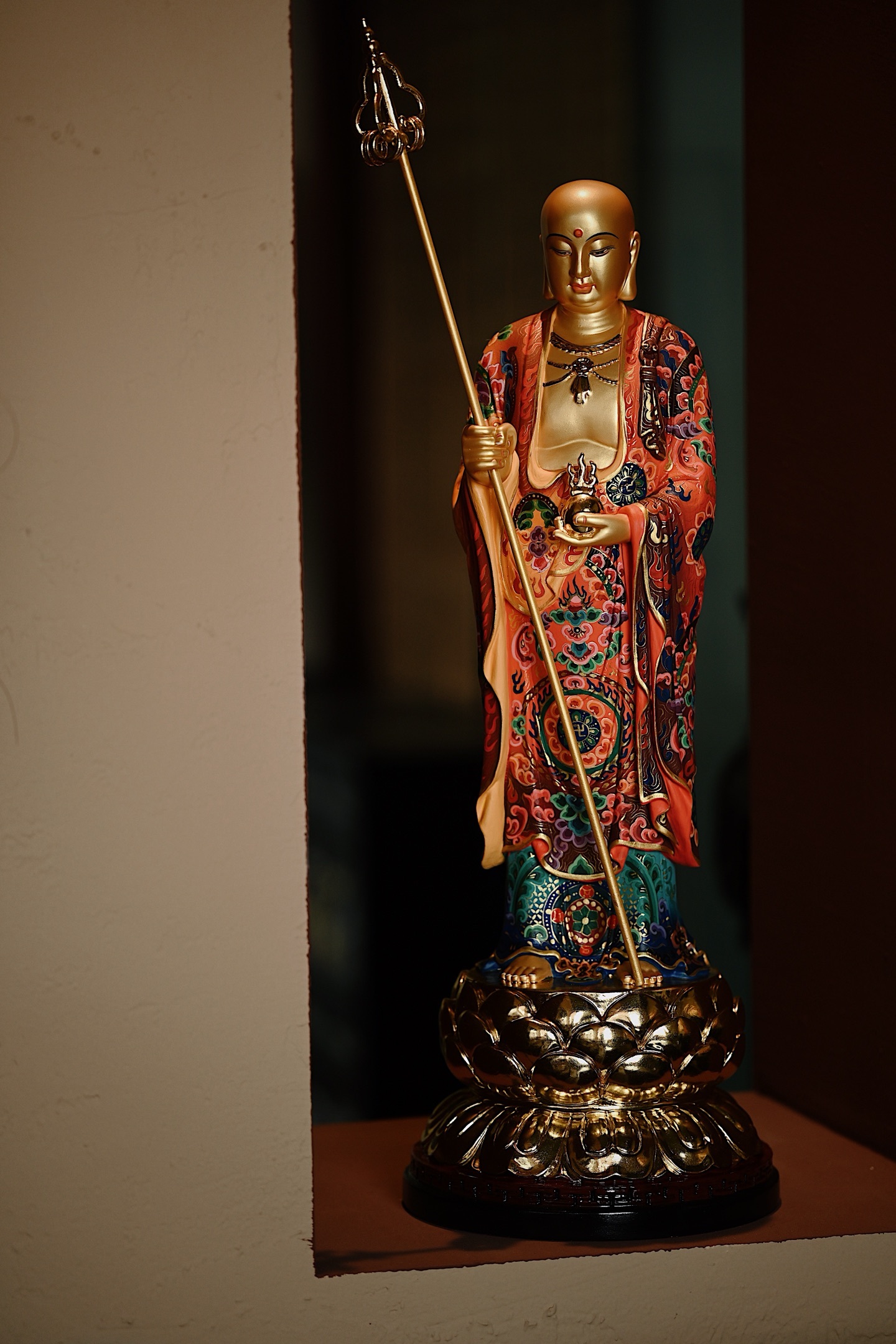 地藏菩萨双目微垂、神态安详,身着僧袍,周身描金银,法相端庄,右手持六环锡杖,左手托宝珠,充满慈悲与力量。