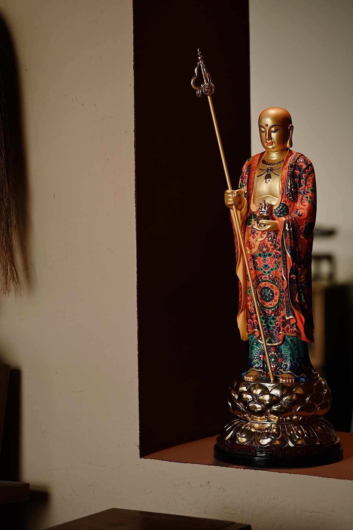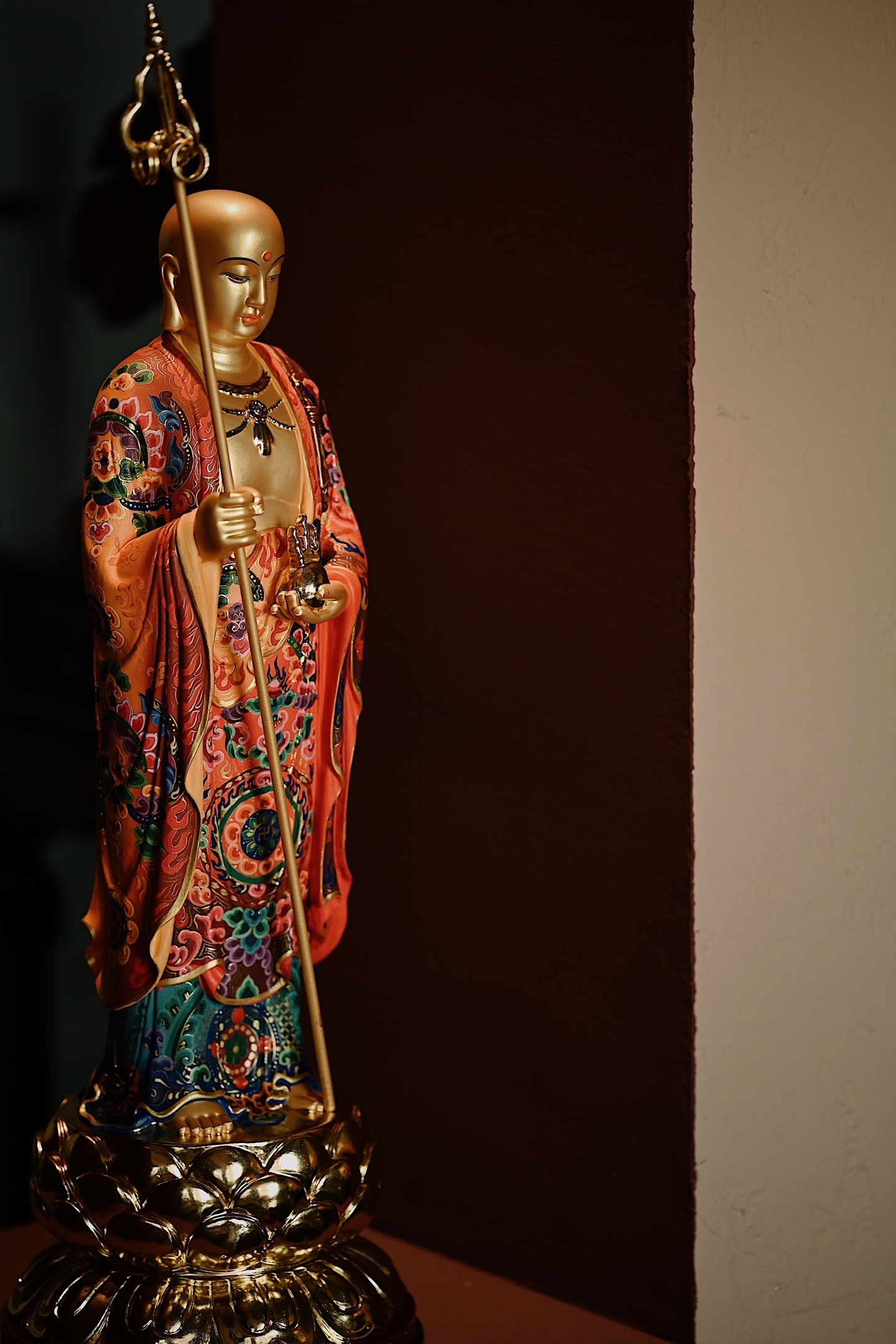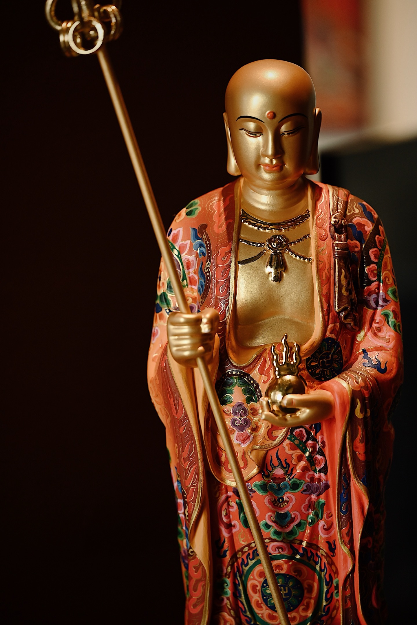 地藏菩萨双目微垂、神态安详,身着僧袍,周身描金银,法相端庄,右手持六环锡杖,左手托宝珠,充满慈悲与力量。