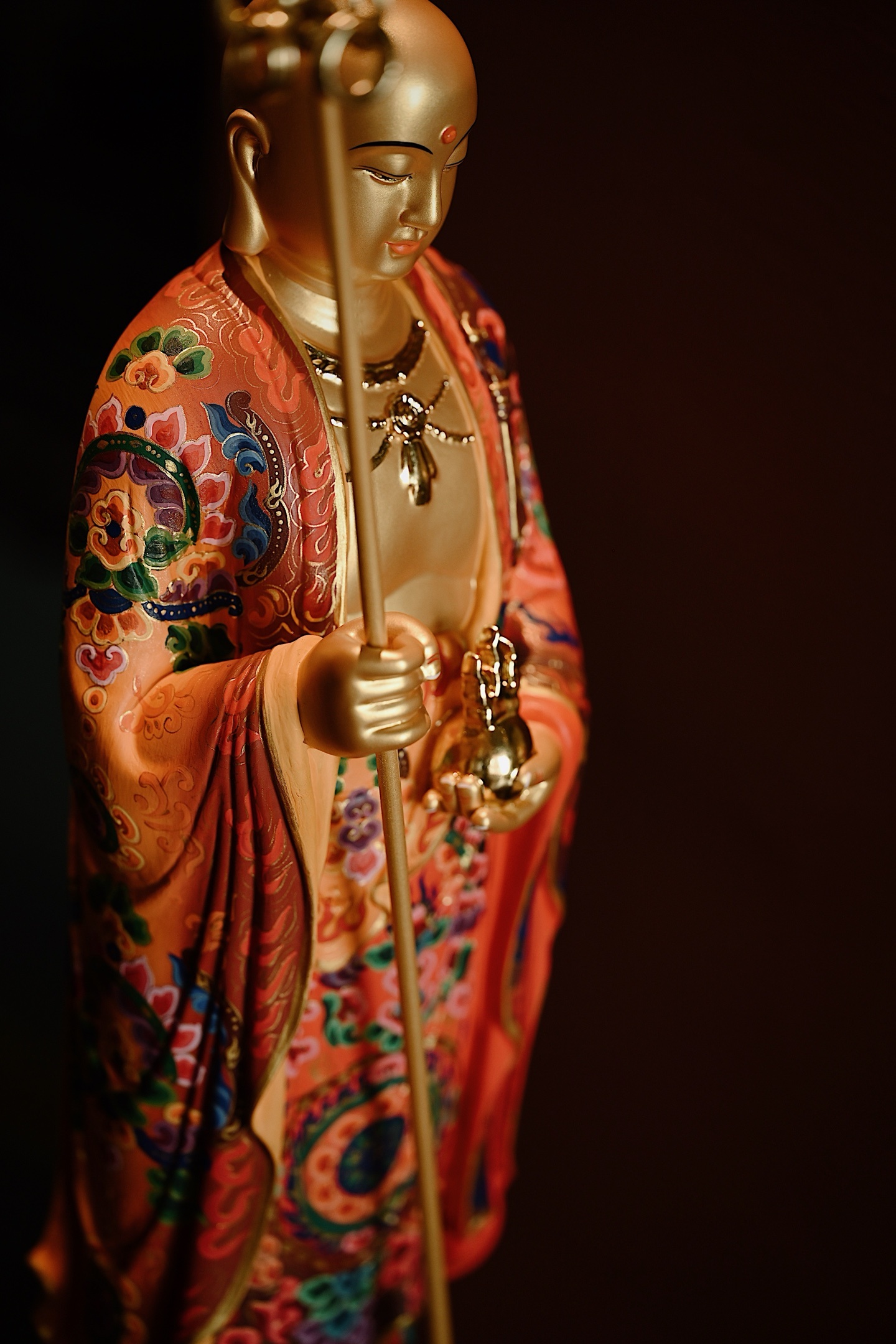 香樟木x彩绘x鎏金 | 地藏王地藏菩萨双目微垂、神态安详,身着僧袍,周身描金银,