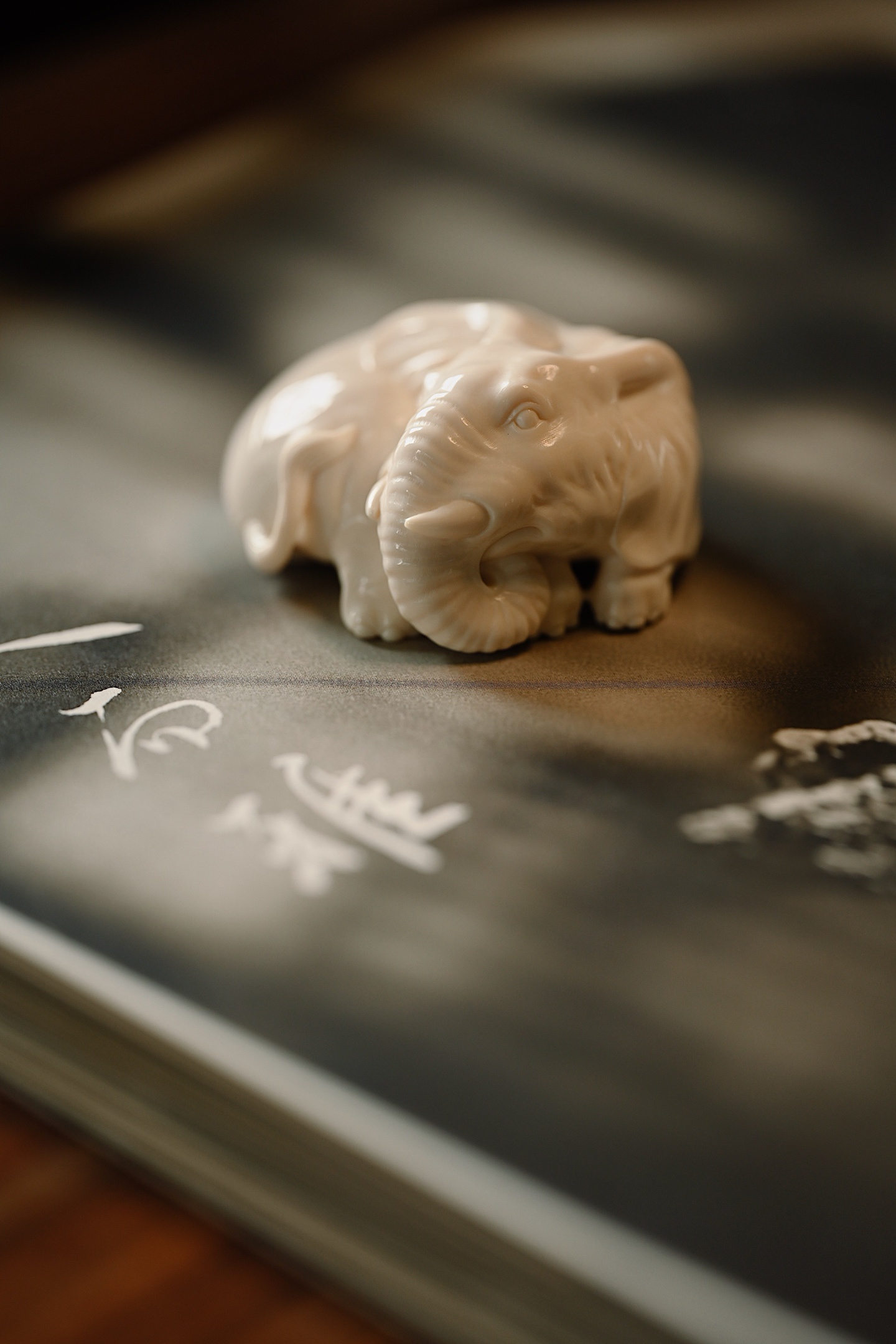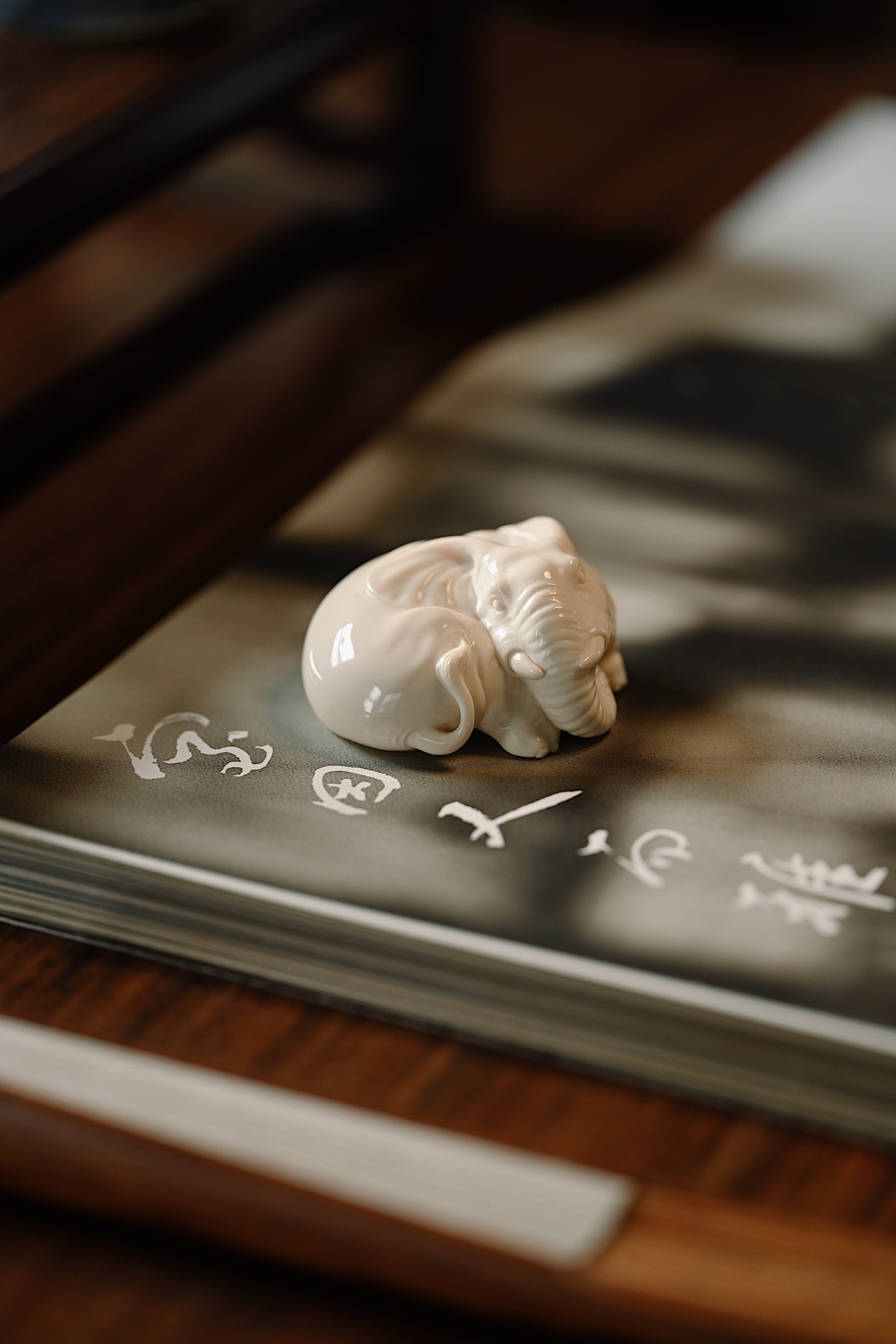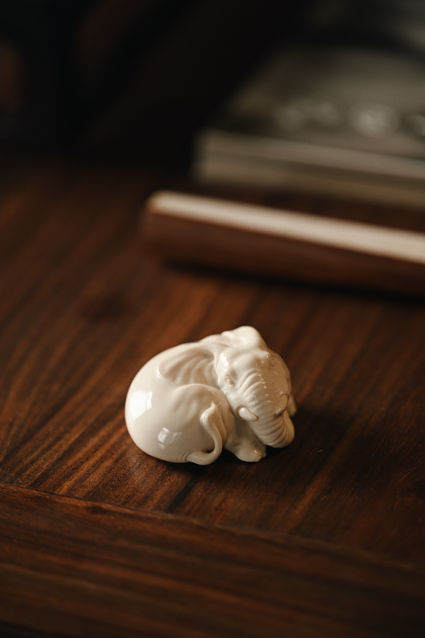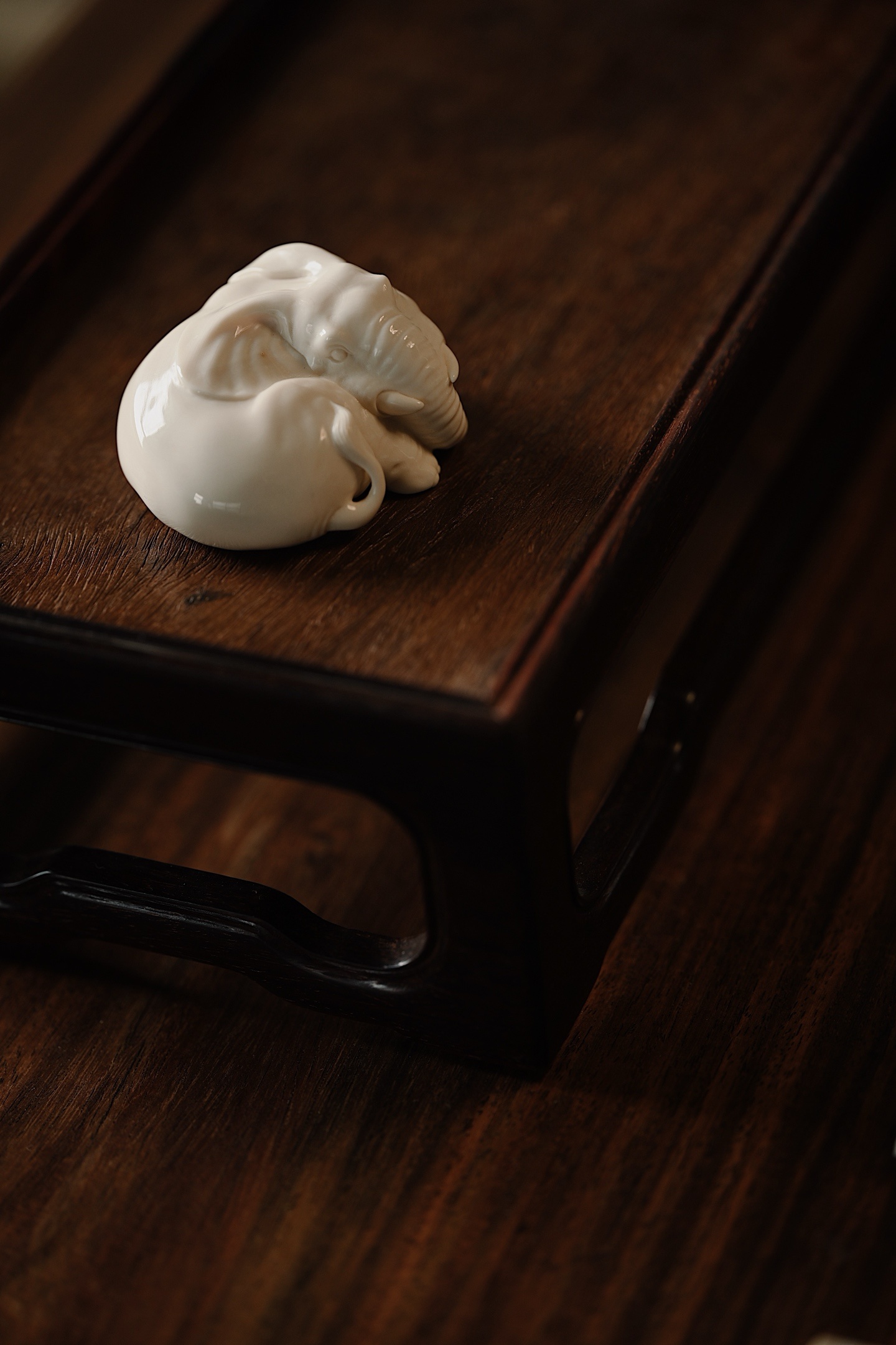 雕刻线条流畅圆润,肌理刻画入微,卧象象首饱满,长鼻卷曲,大耳舒展,四肢蜷伏,体态丰腴憨态,神态安详灵动,「象」谐音「祥」,象征吉祥如意。
