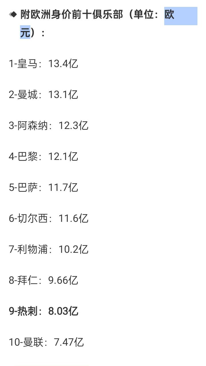 热刺目前全队身价8.03亿欧,排名欧洲第9,英超第5