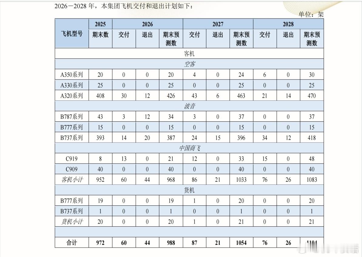 2026年-2028年,分别计划引进60、87和76架飞机,同时计划退出44、21和26架飞机。预计2027年机队规模将突破1000架。