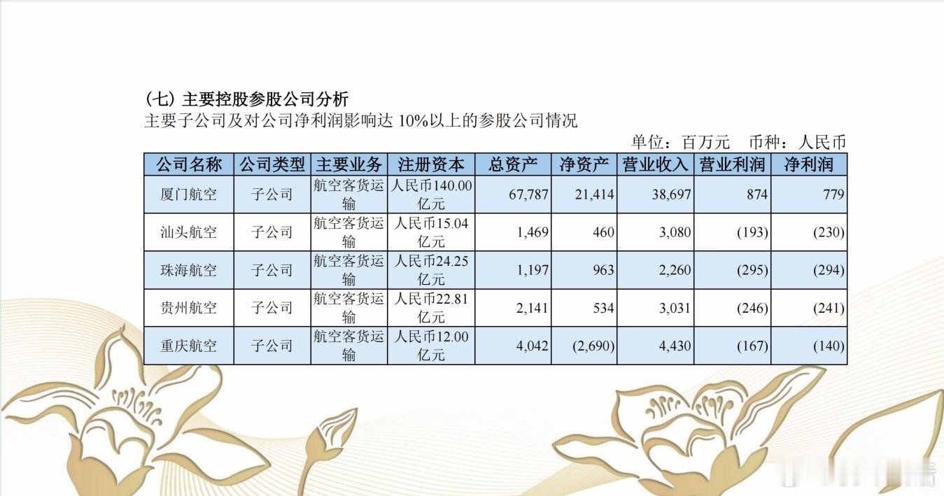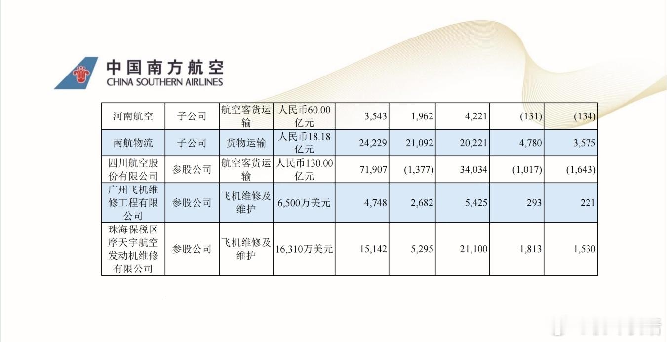 主要控股公司包括厦门航空(盈利7.79亿)、汕头航空(亏损2.3亿)、珠海航空(亏损2.94亿)、贵州航空(亏损2.41亿)、重庆航空(亏损1.4亿)、河南航空(亏损1.34亿)、南航物流(盈利35.75亿)、四川航空(亏损16.43亿)、GAMECO(盈利2.21亿)以及摩天宇(盈利15.3亿),其中南航物流和摩天宇大幅盈利,输血不少。作为对比,国航的年报没有包含国货航,因为国货航早已不再是国航的子公司,而是已独立运营并上市的公司(国货航已经单独发布了年报,盈利25.85亿)。