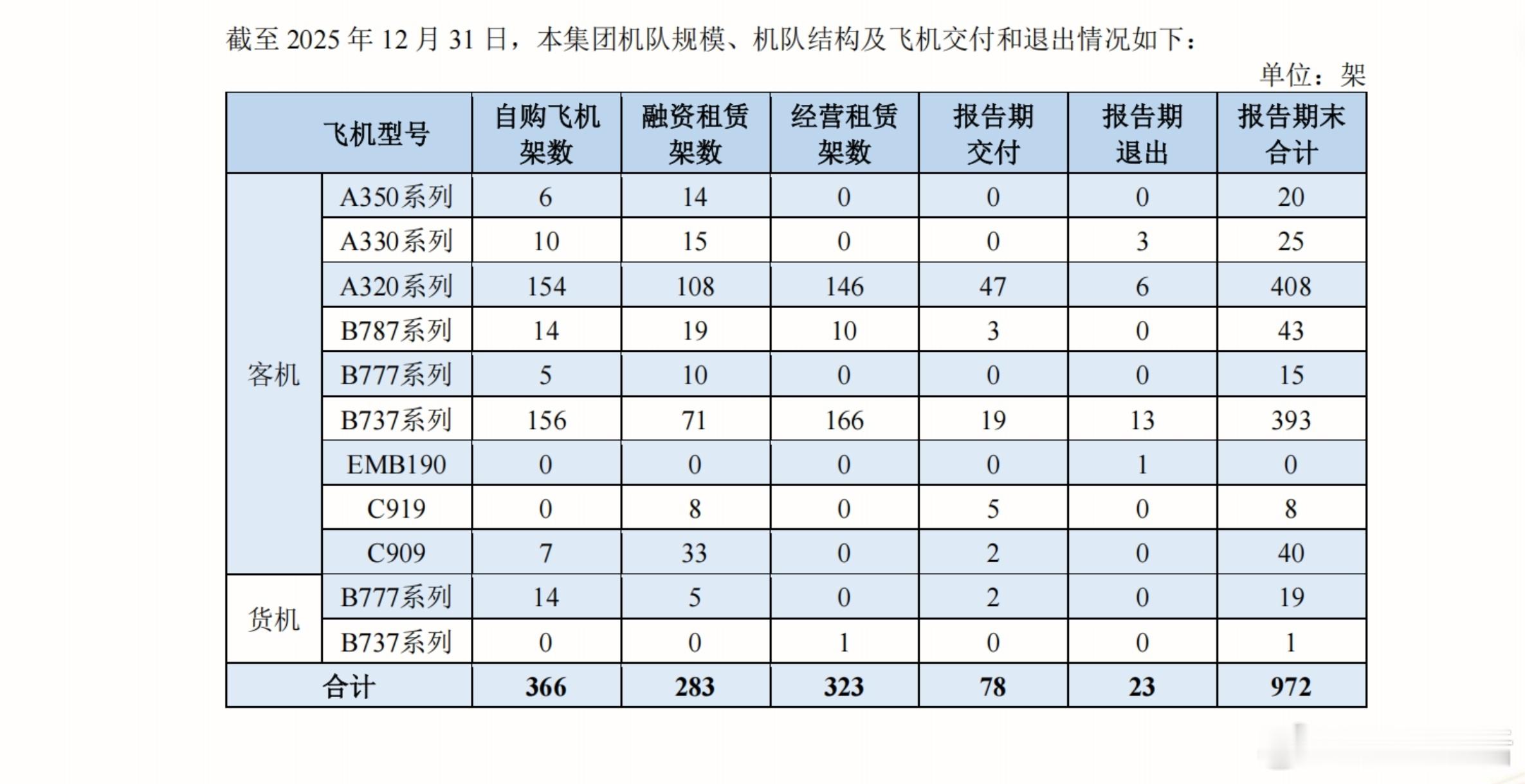 2025年共引进飞机78架(3架B787、2架B777货机、47架A320系列、19架B737、5架C919以及2架C909),共退出飞机23架(3架A330、6架A320系列、13架B737以及一架EMB190)。集团共有飞机972架,比国航964架略多,体量接近千架。