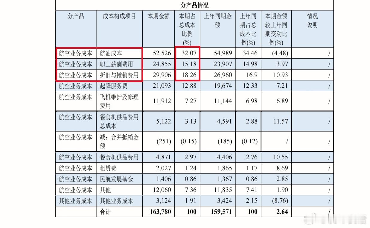 营业成本分析,占比最大的为航空油料(32.07%),其次为折旧与摊销(18.26%)和员工薪酬(15.18%)。