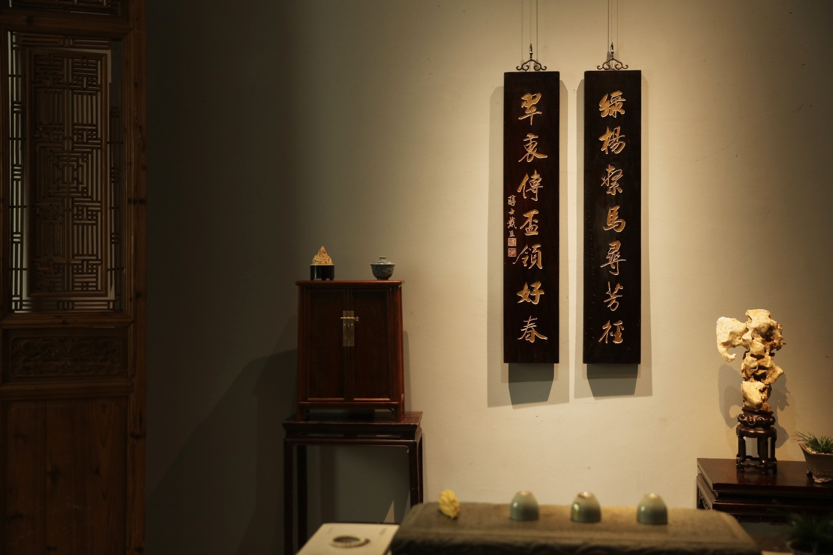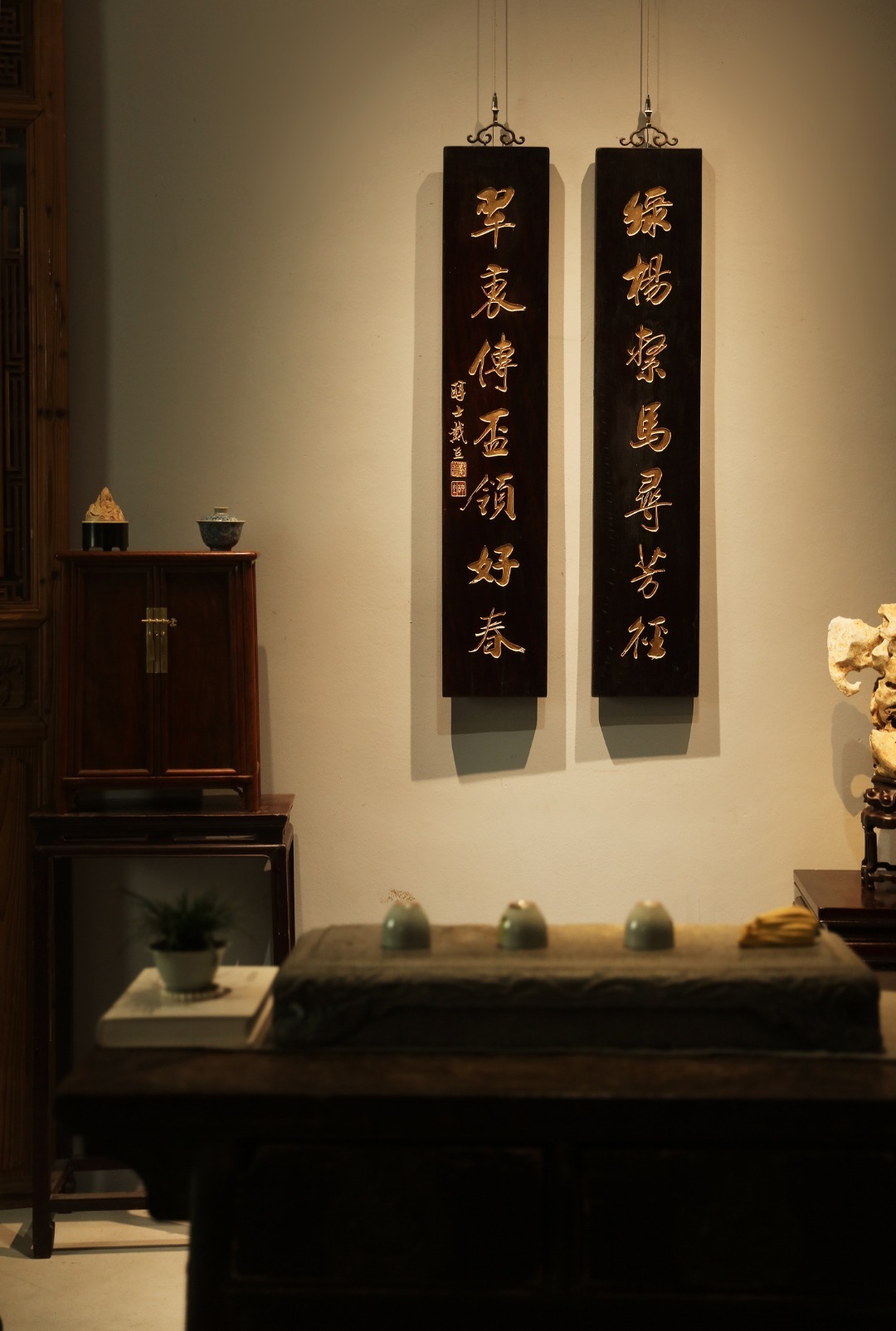 老楠木新工,手工刻画贴金箔;题识“绿杨系马寻芳径,翠袖传杯领好春。”悬于文房雅室,可添文史雅蕴。落款:醇士戴熙
