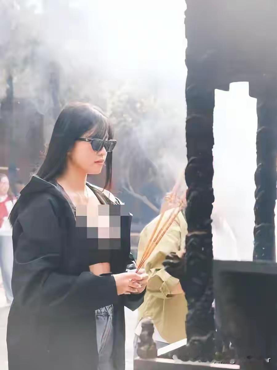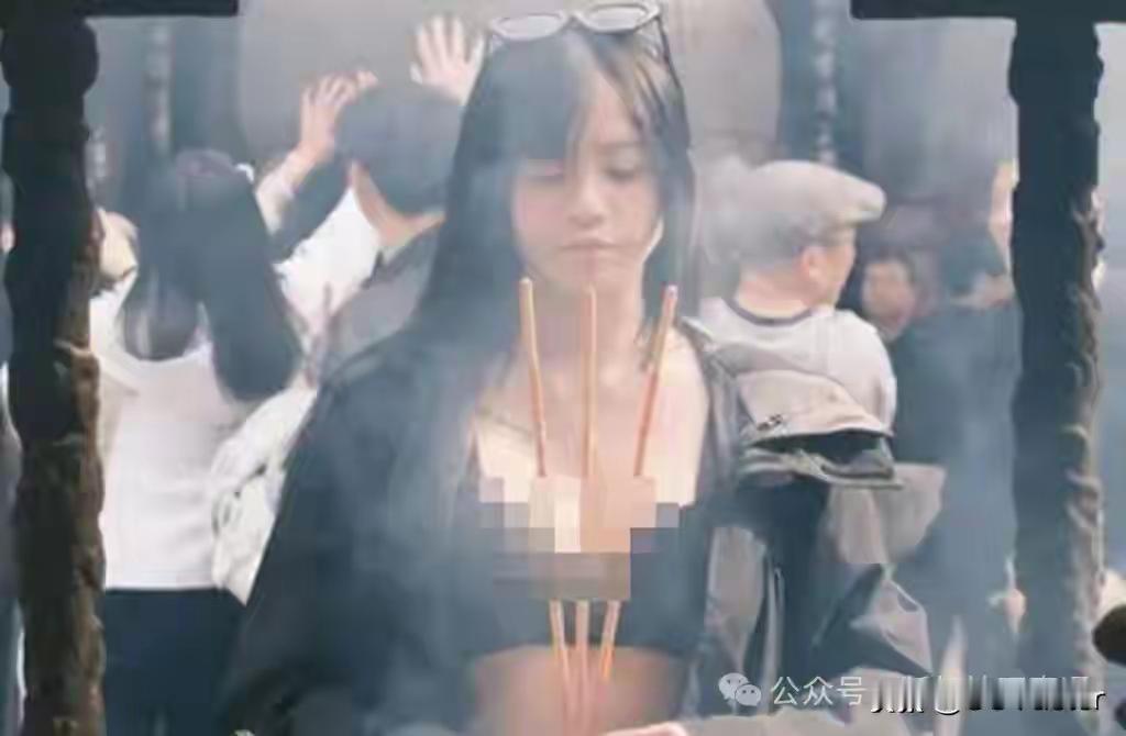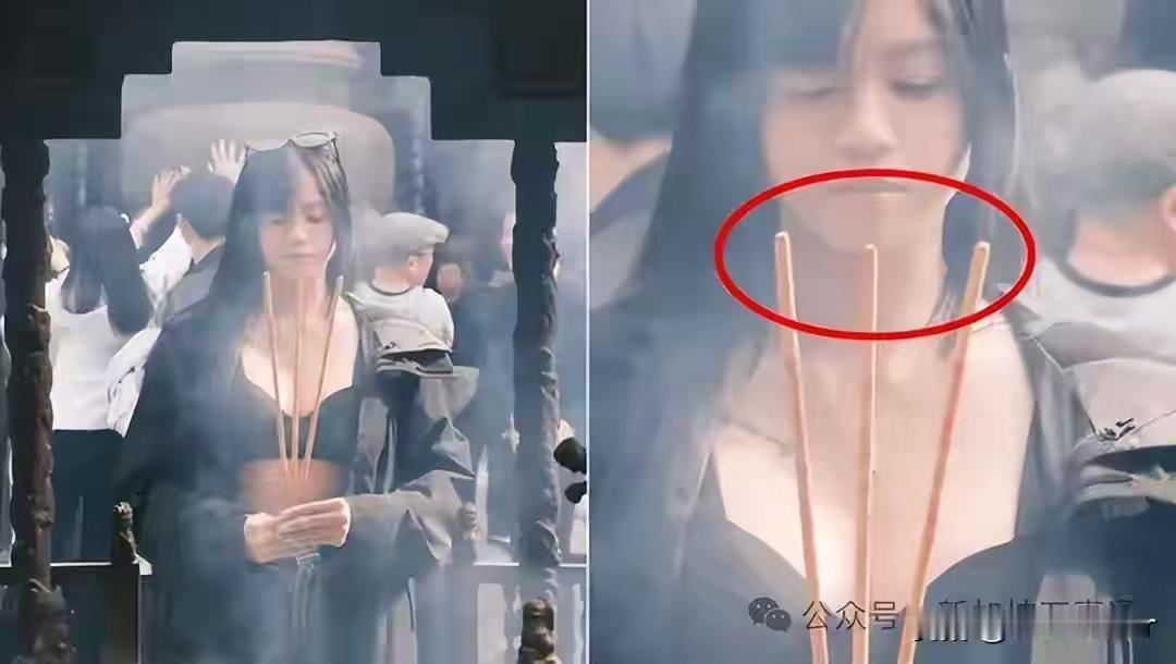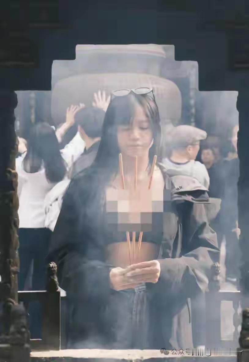 照片中,她身着低胸黑衣,在千年古刹前闭目摆拍,配文却写着“顺遂无虞”的虔诚祝愿。讽刺的是,手中那束未燃的香,彻底揭穿了这场表演的本质——祈福是假,博眼球是真。寺庙的庄严氛围成了性感写真的布景,信仰仪式沦为流量剧本的注脚。