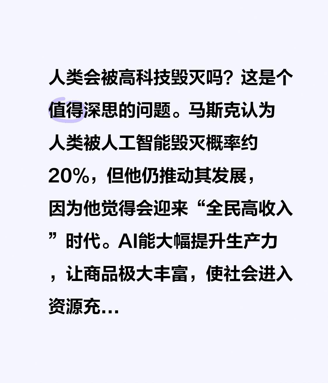 人类会被高科技毁灭吗?这是个值得深思的问题。马斯克认为人类被人工智能毁灭概率约20%,但他仍推动其发展,因为他觉得会迎来“全民高收入”时代。AI能大幅提升生产力,让商品极大丰富,使社会进入资源充裕阶段。