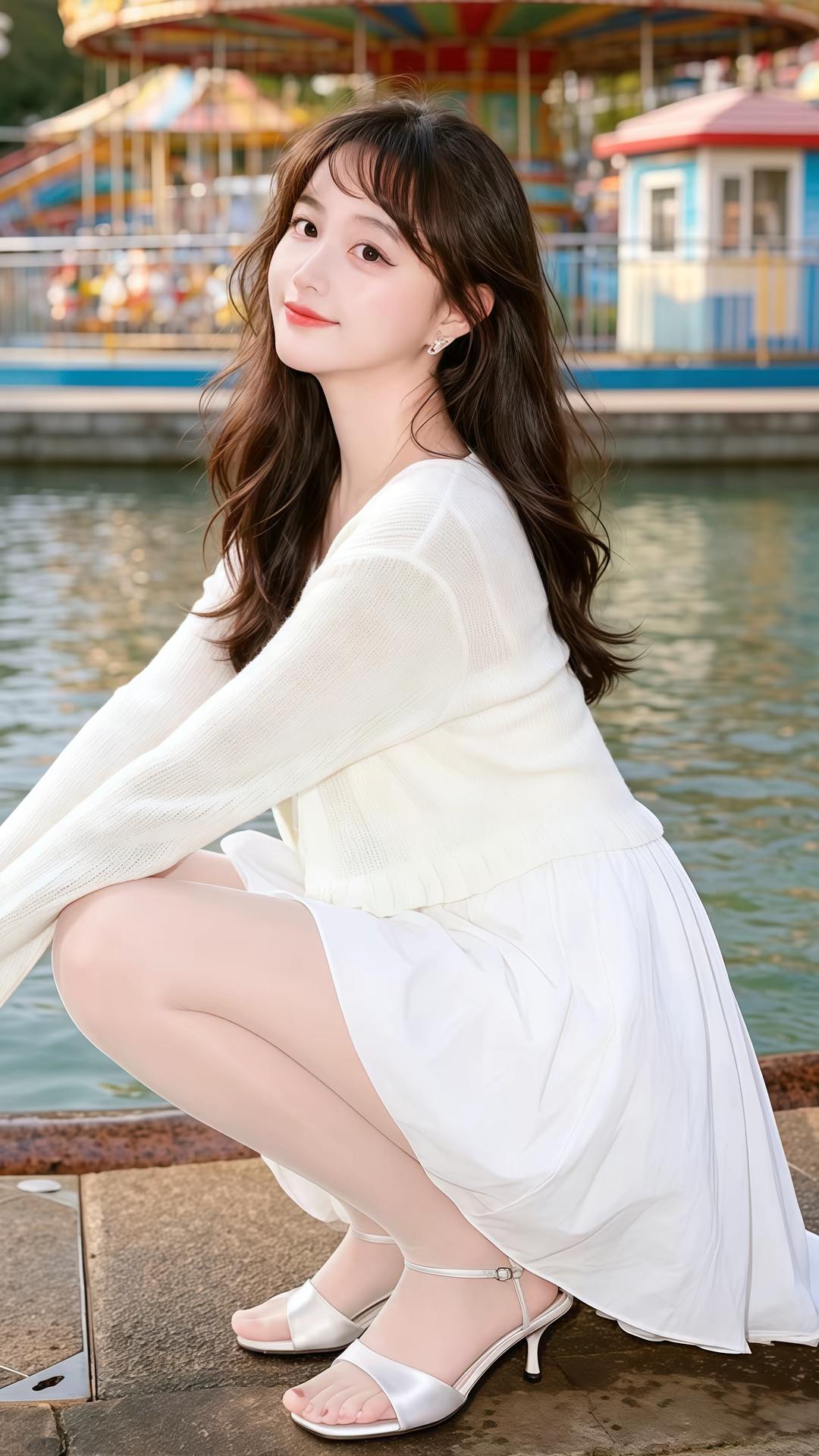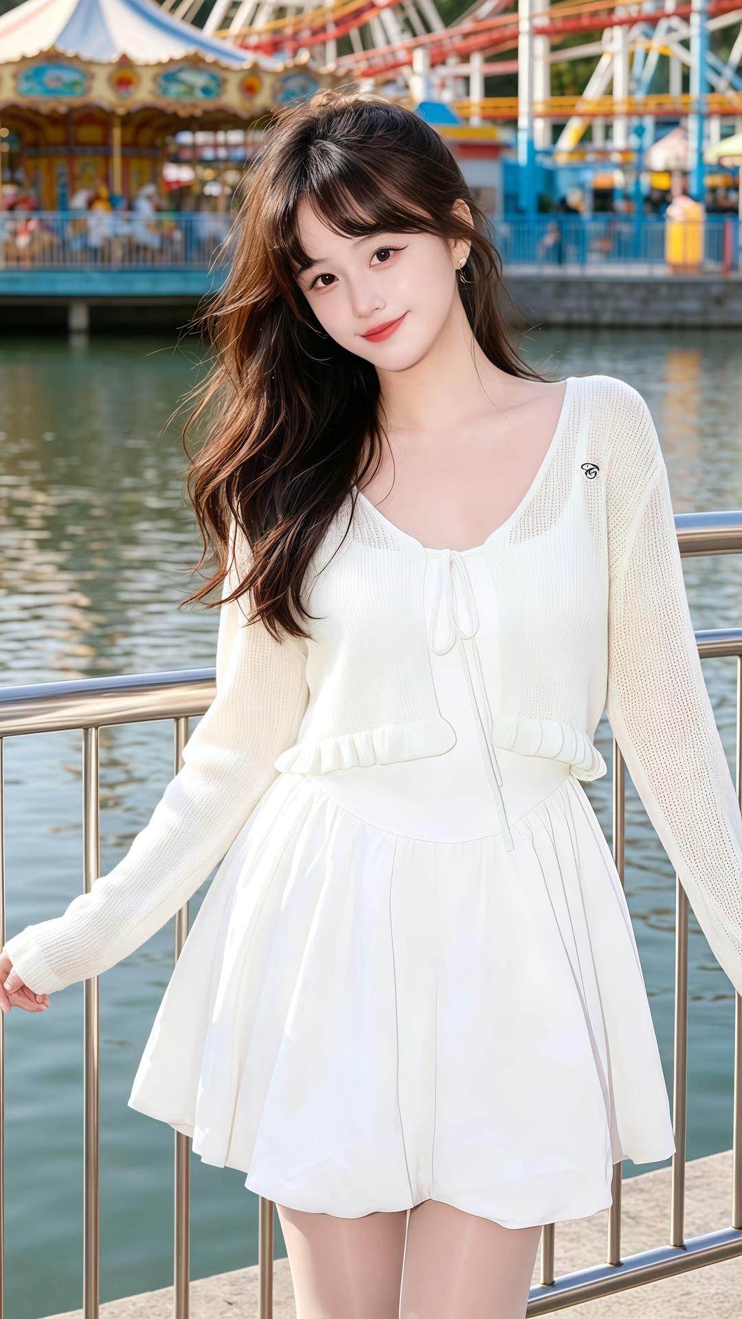 取景在阳光明媚的游乐园江边,摩天轮、旋转木马、湖边花海、滨海列车都充满治愈氛围感,晴朗通透的自然光干净又明亮。