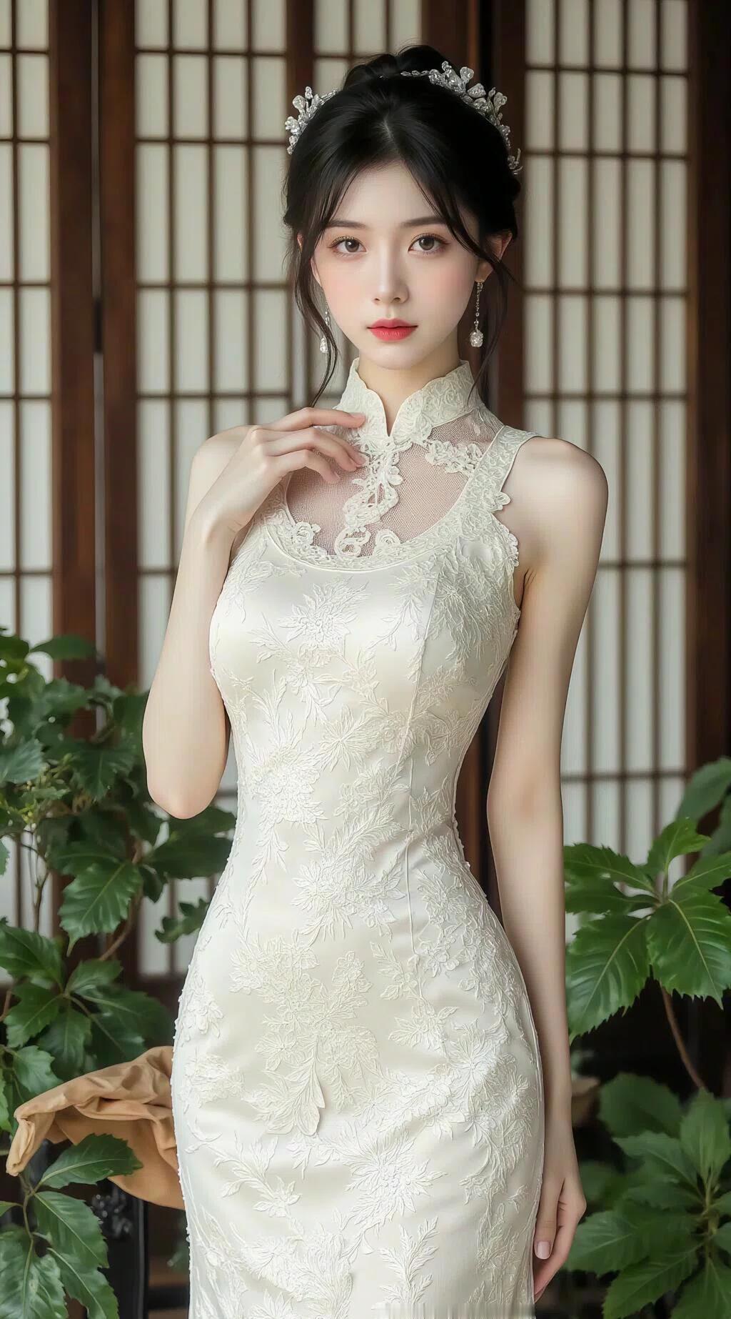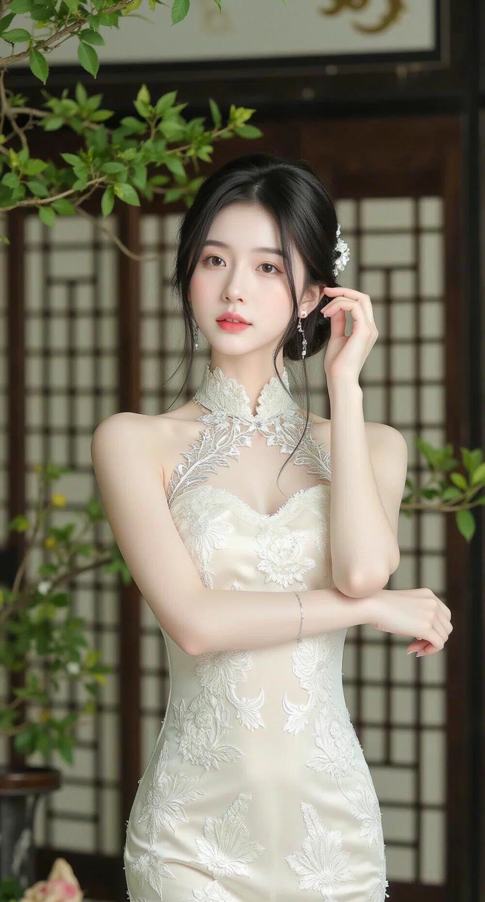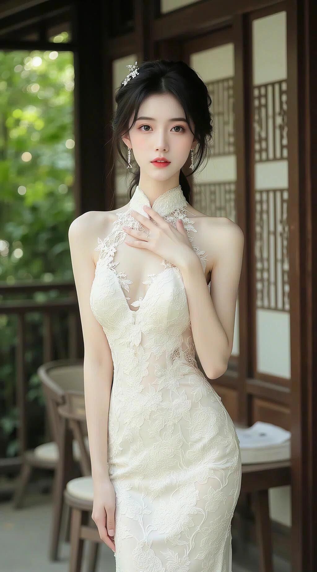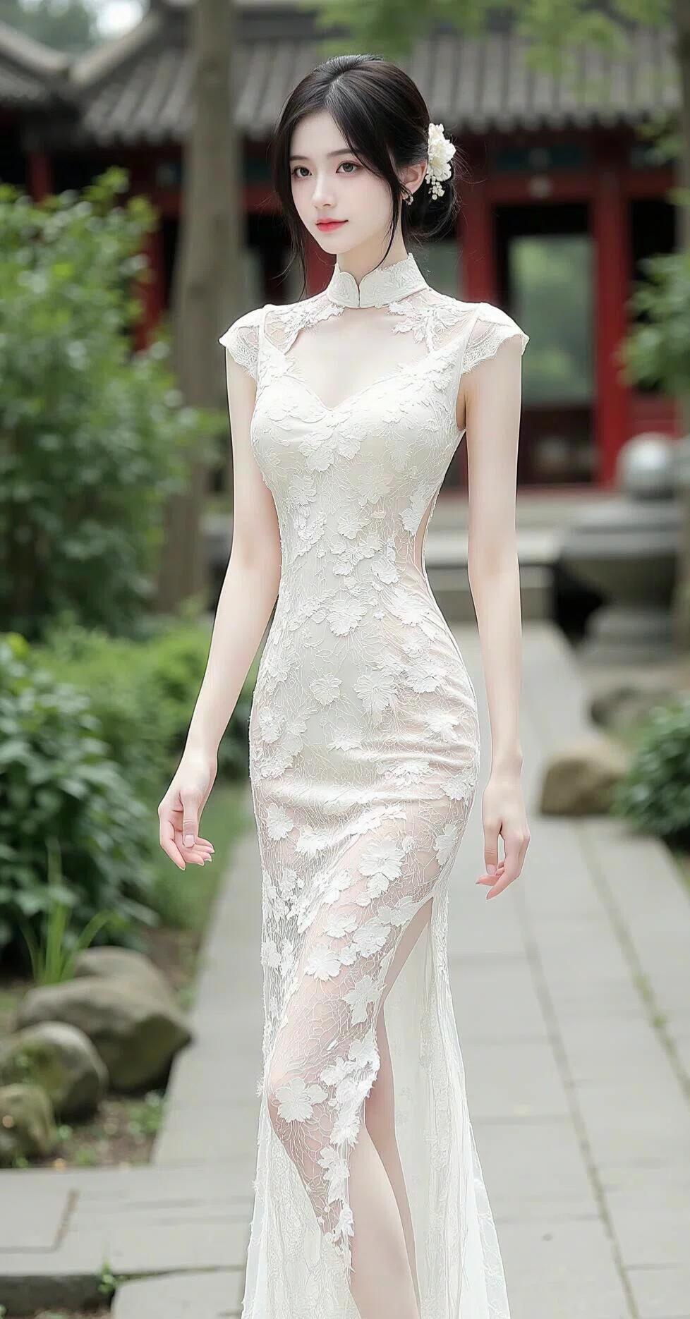 一身奶白色新中式蕾丝刺绣旗袍,每一款都独具韵味:立领盘扣勾勒东方脖颈线条,通透网纱透视、精致花卉蕾丝刺绣、后背小心机镂空、挂脖露肩设计,把温婉身段完美勾勒,缎面面料细腻高级,修身鱼尾版型衬得身姿曼妙,高开叉与轻纱裙摆更添仙气。